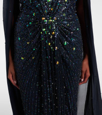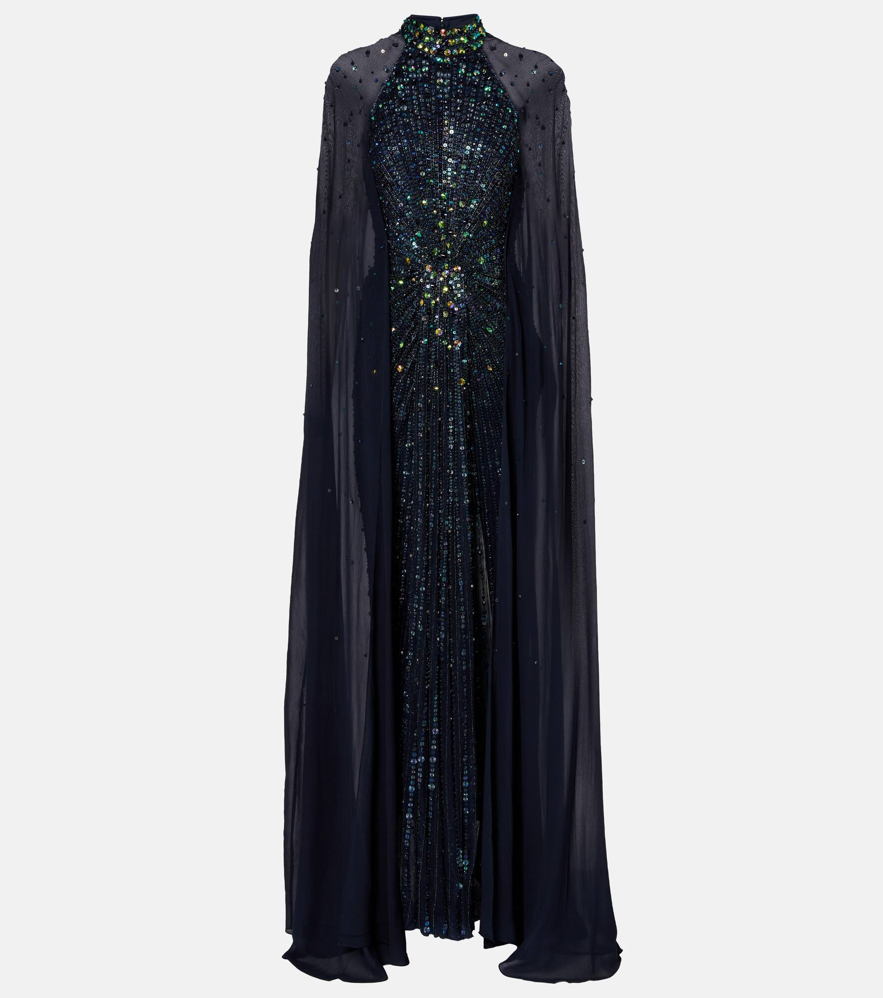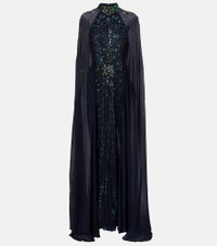 Enriched with romance, Jenny Packham’s intricately embellished designs are made to make an entrance. The Thea caped gown is finished with sequin embellishments, a mockneck, and a zipped back. Product Details - Material: 100% nylon - Care instructions: dry clean - Made in India - Designer color name: Ink - Item color: blue - Lining: 95% polyester, 5% elastane - Collar: mockneck - Closure: concealed zipper, zipped back - Item number: P01077506 Size & Fit - True to size - Fitted - Loose outer layer - Non-stretchy fabric - The model seen in the picture is 178cm-5'10" and wearing a size UK 8