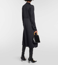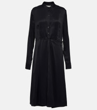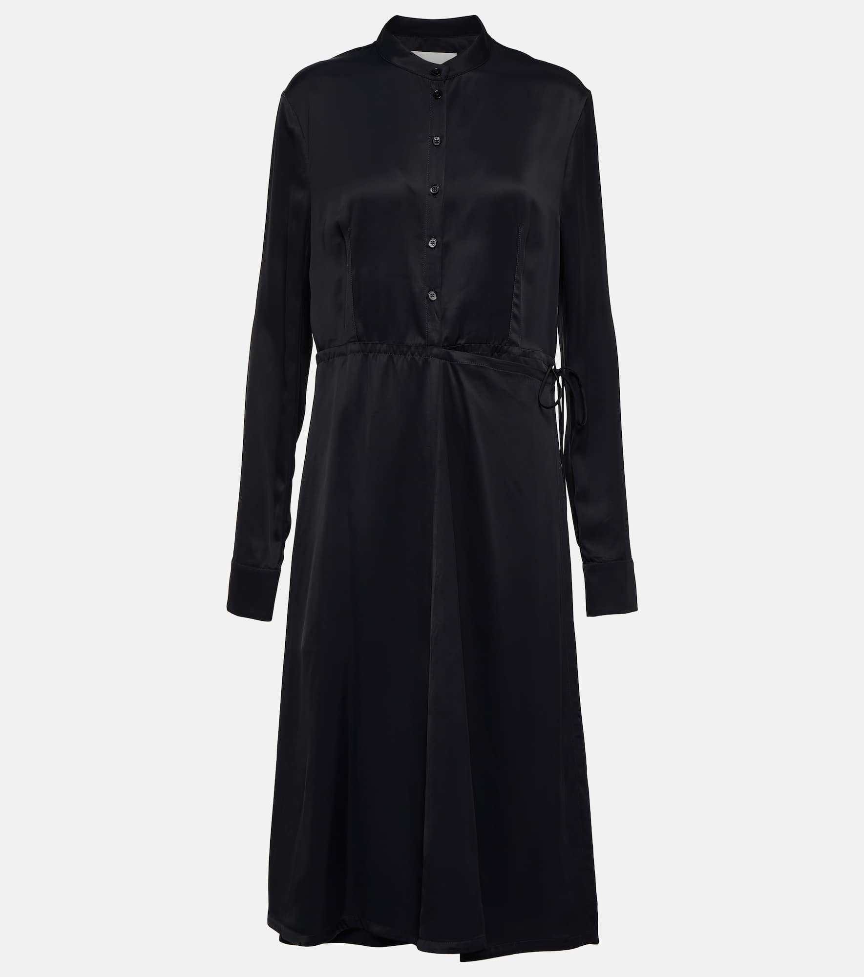 Jil Sander's sophisticated minimalism is characterized by neutral tones, clean lines, and precisely-placed details. This long-sleeved dress is made to an A-line midi silhouette with a halfway buttoned design. Product Details - Made in Italy - Care instructions: dry clean - Material: 100% viscose - Designer color name: Navy - Item number: P00827744 Size & Fit - Fits large to size - we recommend trying one size smaller - Loose fit, drawstring waist - Mid-weight material - DT = German size - The model seen in the picture is 178cm-5'10" and wearing a size DT 32