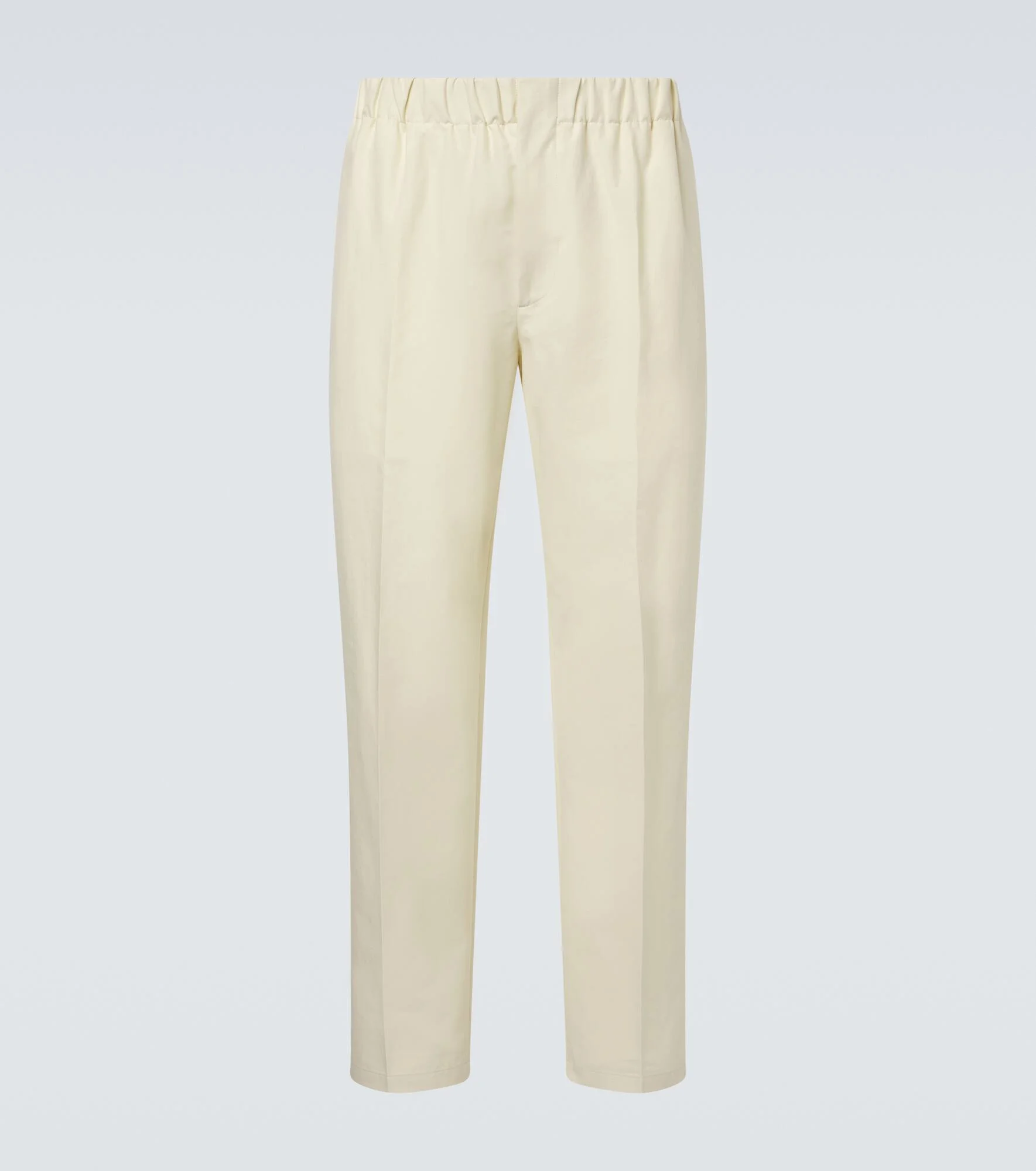 Jil Sander reinvents tailoring with minimalist, clean lines and impeccable attention to detail. These versatile pants are cut from cotton to an always-stylish tapered silhouette and finished with an elasticated waist. Product Details - Material: 100% cotton - Care instructions: dry clean - Made in Italy - Color: white - Designer color name: Cornsilk - Pocket lining: 100% cotton - Lining: 100% cotton - Contains non-textile parts of animal origin - Closure: zipper fly, button fastening - Elasticated drawstring waist - Pockets: side slit pockets, back pockets - Item number: P01103872 Size & Fit - True to size - Elasticated waist - Adjustable at the waist - Non-stretchy fabric - Straight leg - Height of model is 192cm-75.5" and wears a size 50