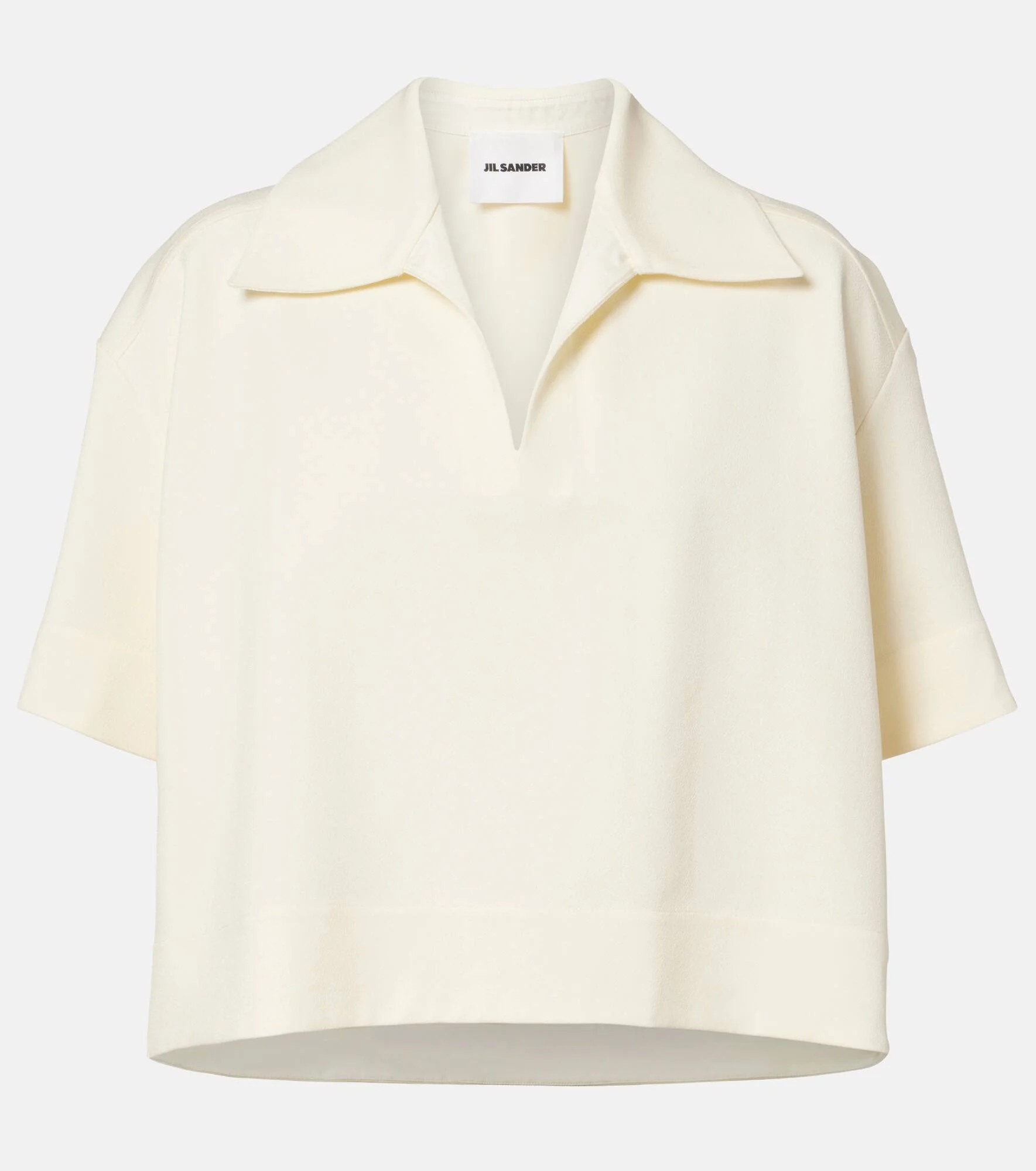 Jil Sander's sophisticated minimalism is characterized by neutral tones, clean lines, and precisely-placed details. This classic polo shirt will become your next go-to for everyday refinement. Product Details - Material: 78% viscose, 16% polyamide, 6% elastane - Care instructions: dry clean - Made in Italy - Color: white - Designer color name: Chalk - Lining: 100% viscose - Item number: P01127628 Size & Fit - True to size - Dropped shoulders - Designed for a loose fit - Non-stretchy fabric - Slightly cropped - The model seen in the picture is 178cm-5'10" and wearing a size DE 34