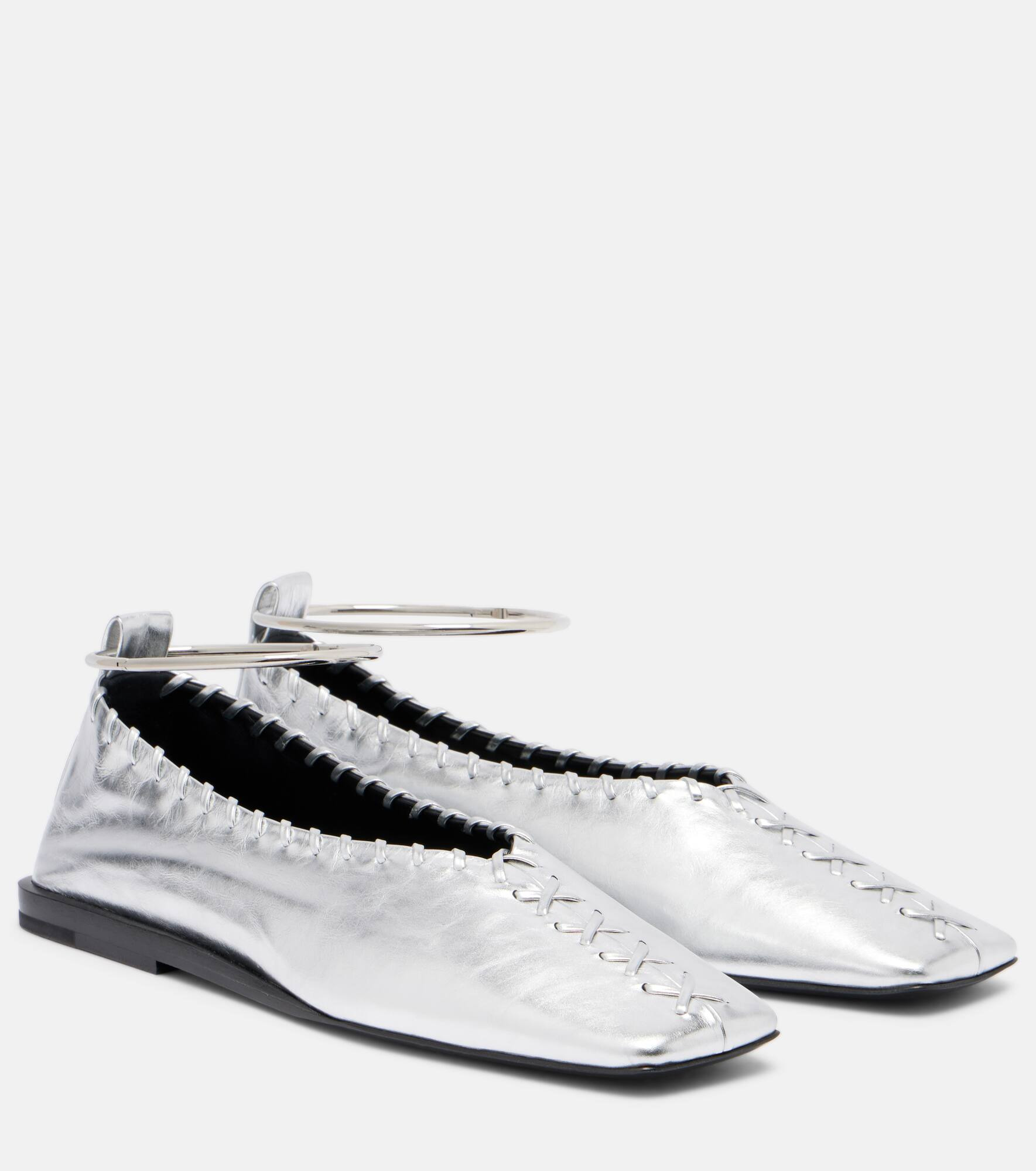 Crafted in Italy from laminated leather, these ballet flats from Jil Sander showcase stitching details. The piece is finished with a detachable metal ankle bracelet. Product Details - Upper: calf leather - Lining: leather - Sole: leather insole, leather and rubber sole - Toe shape: square toe - Made in Italy - Includes: shoe box - Designer color name: Sky Grey/Silver - Item color: silver - Item number: P01097577 Size & Fit - True to size - Slightly narrow - European sizes