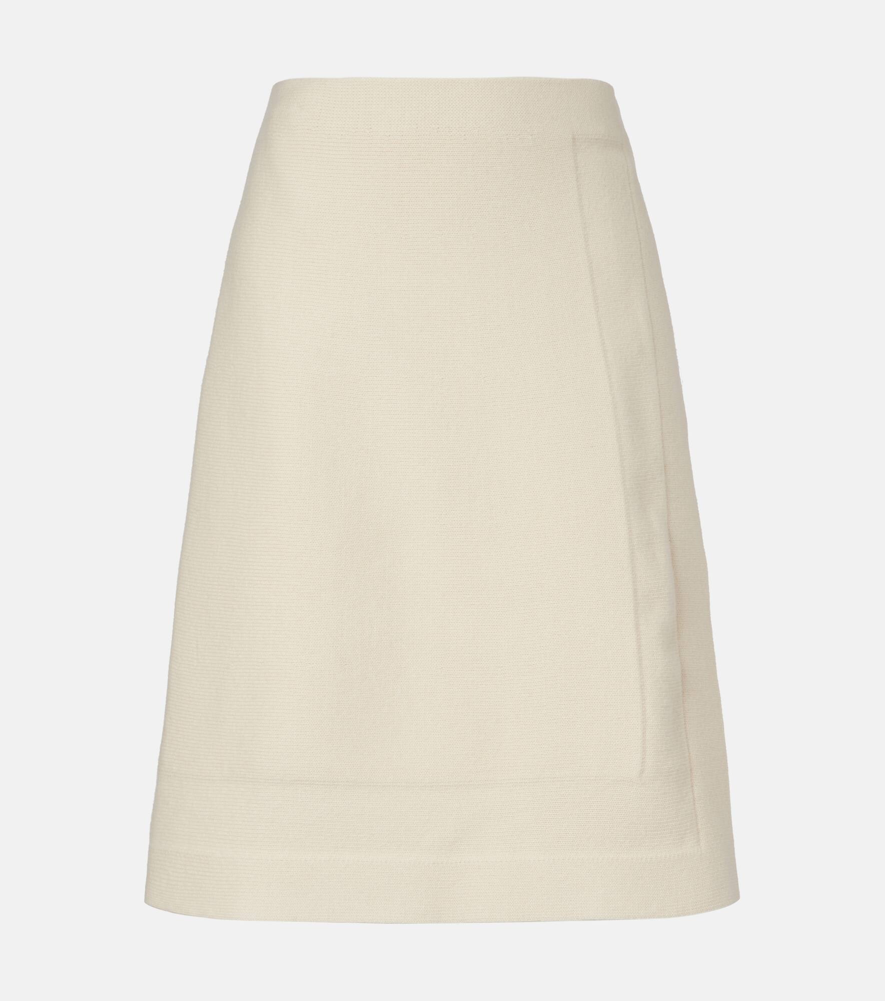 Jil Sander's sophisticated minimalism is characterized by neutral tones, clean lines, and precisely-placed details. Made in Italy from a blend of wool, cotton, and cashmere, this wrap skirt has a midi length. Product Details - Material: 80% wool, 12% cotton, 4% cashmere, 2% polyester, 2% polypropylene - Care instructions: dry clean - Made in Italy - Designer color name: Stone - Item color: white - Item number: P01045500 Size & Fit - Fits large to size - we recommend trying one size smaller - Slightly stretchy fabric - The model seen in the picture is 178cm-5'10" and wearing a size DE 32