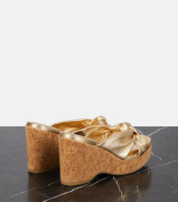 Slip into the Avenue leather sandals from Jimmy Choo for effortless sophistication. Made from butter-soft nappa leather that's ruched and knotted at the square toes, they're set atop comfortable cork wedges. Product Details - Lining: leather - Sole: leather insole, rubber sole - Trim: cork - Made in Spain - Comes with a box - Designer color name: Gold - Comes with dust bag - Upper: leather - Toe shape: square open toe - Item number: P00819201 Size & Fit - True to size - European sizes - 3,5cm-1.5" platform (size EU 38) - 10cm-4" wedge heel (size EU 38)
