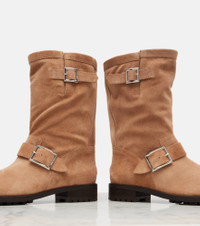 These Biker boots from Jimmy Choo are defined by a suede construction and mid-calf silhouette. The design showcases a hardy finish, complete with two buckled straps on both sides. Product Details - Upper: calf leather (suede) - Lining: leather - Sole: leather insole, rubber sole - Toe shape: round toe - Made in Italy - Includes: shoe box, dust bag - Designer color name: Toffee - Item color: beige - Hardware color: silver - Item number: P01125546 Size & Fit - True to size - European sizes - 2cm-1" platform (size EU 38) - 3,5cm-1.5" wedge heel (size EU 38)