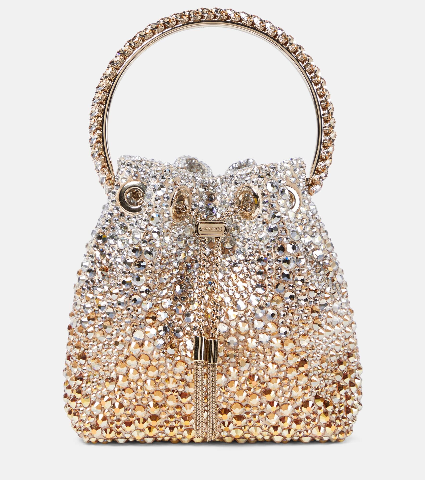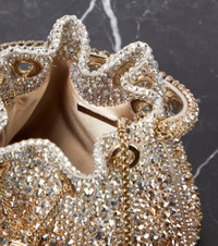 Jimmy Choo's Bon Bon bucket bag will finish any look on a glamorous note. Made in Italy, this design is covered in iridescent crystal embellishments of differing sizes and features a tasseled chain drawstring. Product Details - Top handle, Chain shoulder strap - Comes with dust bag - Designer color name: Gold/ Silver - Made in Italy - Closure: drawstring top - Color of fastening: pale gold - Trim: crystals - Material: fabric - Internal details: fabric lining - Item number: P00759404 Size & Fit - Height 15cm-6" - Width 14cm-5.5" - Depth 9cm-3.5" - Chain length 116cm-45.5" - Length of handle 28cm-11"