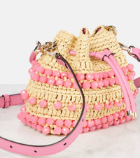 Aptly named, the Bon Bon bucket bag from Jimmy Choo is the definition of arm candy. Made in Italy, the woven design has contrast beading and the iconic loop handle. Product Details - Material: fabric - Lining: fabric - Made in Italy - Designer color name: Natural/Fuchsia - Item color: beige, pink - Trim: leather - Top handle, Detachable shoulder strap - Closure: drawstring top - Hardware color: gold - Item number: P01026076 Size & Fit - Height 17cm-6.5" - Max. width 19cm-7.5" - Depth 9cm-3.5" - Length of handle 32cm-12.5" - Adjustable shoulder strap - Min. length shoulder strap 69cm-27" - Max. length shoulder strap 118cm-46.5"
