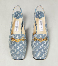 Jimmy Choo's Diamond Tilda style is reintroduced in a slingback silhouette. Made from denim with the brand’s monogram detailed all over, these pumps rest on angular block heels and are embellished with the brand's diamond-link chain hardware. Product Details - Lining: leather - Upper: fabric - Sole: leather insole and sole - Toe shape: square toe - Closure: elasticated strap - Designer color name: Denim - Comes with a box - Made in Italy - Comes with dust bags - Item number: P00770092 Size & Fit - True to size - European sizes - 4,5cm-2" heel (size EU 38)