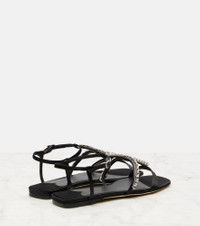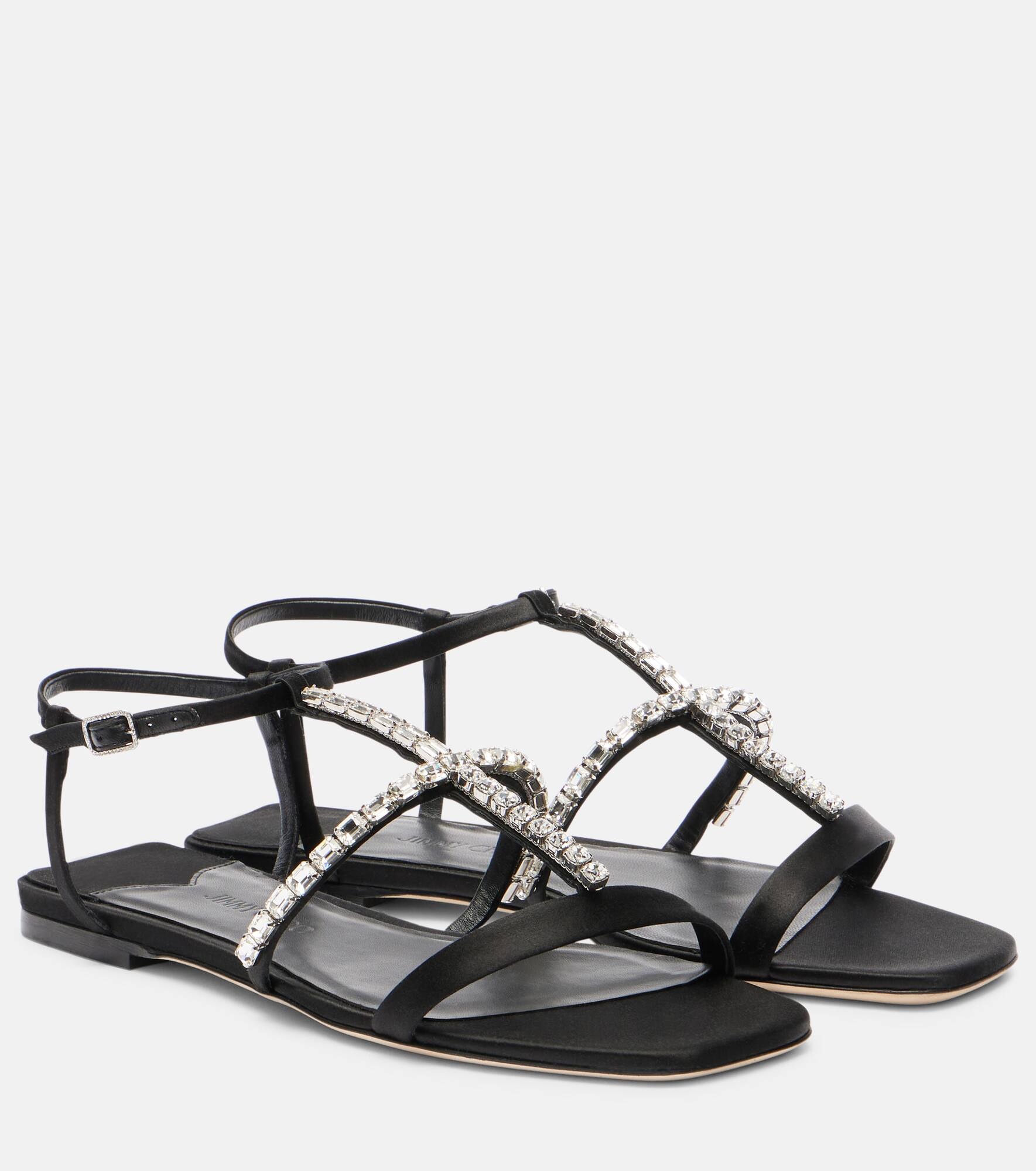 Jimmy Choo is a global luxury fashion brand defined by glamour, optimism, and joy. The Gwyn sandals are made from black satin with shimmering crystal embellishments. Product Details - Upper: satin - Lining: satin - Sole: leather insole and sole - Toe shape: square open toe - Made in Italy - Includes: shoe box, dust bag - Designer color name: Black/Crystal - Item color: black - Item number: P01070952 Size & Fit - True to size - European sizes