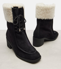 The Hali ankle boots from Jimmy Choo are expertly crafted in Italy from smooth suede and finished with a shearling trim along the shaft. This pair features a square-toe silhouette, 60mm block heels, and a lace-up closure. Product Details - Upper: leather (suede) - Lining: shearling - Sole: leather insole, rubber sole - Toe shape: square toe - Made in Italy - Includes: dust bag, shoe box - Designer color name: Black/Natural - Item color: black, white - Trim: shearling - Hardware color: silver - Closure: lace-up - Item number: P01109744 Size & Fit - True to size - Slightly narrow at the back - European sizes - 6cm-2.5" heel (size EU 38) - 2cm-1" platform (size EU 38)
