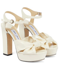 Make a bold statement in the cream Heloise patent leather sandals from Jimmy Choo. Made in Italy, they are set on dramatic platforms with 120mm heels and feature chunky knotted straps that cross over the toes. Product Details - Toe shape: round open toe - Lining: leather - Upper: calf leather - Sole: leather insole and sole - Closure: buckle-fastening ankle strap - Designer color name: Latte - Comes with a box - Made in Italy - Comes with dust bag - Item number: P00622456 Size & Fit - Fits small to size - we recommend trying one size larger - European sizes - 12cm-4.5" heel (size EU 38) - 3,5cm-1.5" platform (size EU 38)