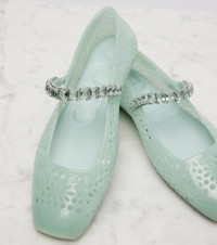 Crafted in Italy, the Jelly ballet flats from Jimmy Choo are embellished with crystals along their straps. This design features perforated uppers and leather insoles on square-toe silhouettes. Product Details - Upper: rubber, crystals - Lining: rubber - Sole: leather insole, rubber sole - Toe shape: square toe - Made in China - Includes: dust bag, shoe box - Designer color name: Light Verd - Item color: green - Item number: P01071210 Size & Fit - True to size - Half sizes please take the next size down - European sizes
