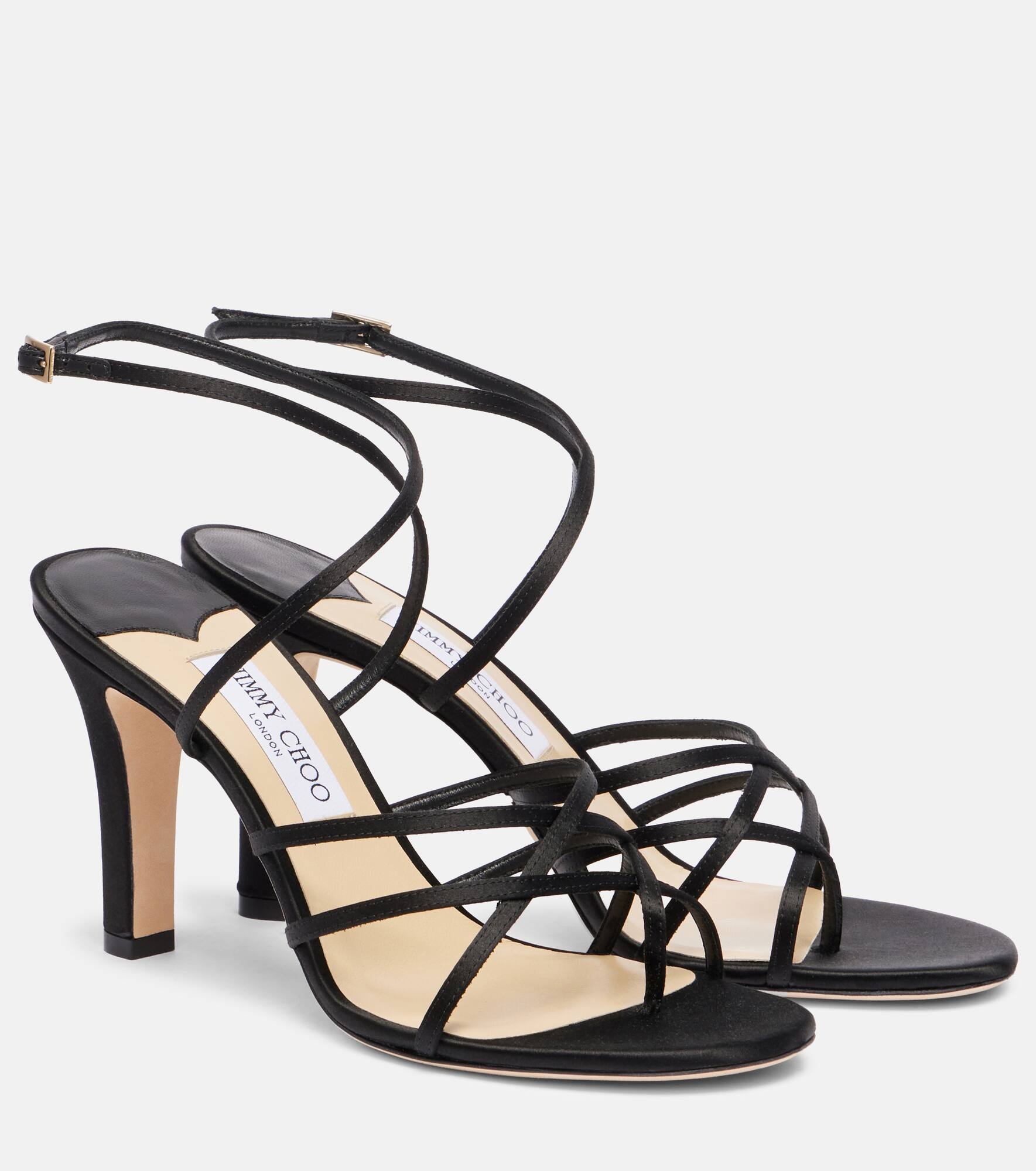Crafted in Italy from satin, the Strappy sandals from Jimmy Choo feather leather insoles and soles on round open-toe silhouettes. This design originally debuted in 1997 and was part of the brand's first collection. Product Details - Upper: fabric - Lining: leather - Sole: leather insole and sole - Toe shape: round open toe - Made in Italy - Includes: dust bags, shoe box - Designer color name: Black - Item color: black - Closure: buckle-fastening ankle strap - Item number: P01072755 Size & Fit - True to size - European sizes - 10cm-4" heel (size EU 38)