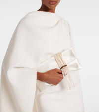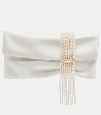 Radiate sophistication with Jimmy Choo's accessories, including the Zandra clutch. In a soft silhouette, this design is made from lustrous satin fabric and adorned with cascading pearls. Product Details - Material: fabric - Lining: fabric - Made in Italy - Designer color name: Ivory/Light Gold - Item color: white - Details: brass, pearls - Closure: magnetic fastening - Internal details: internal slot pocket - Includes: dust bag, box - Item number: P01054834 Size & Fit - Height 15cm-6" - Width 30cm-12"