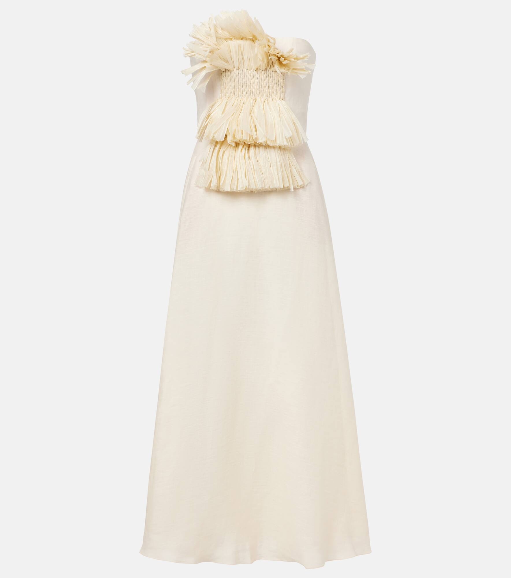 Make a summertime statement with this maxi dress from Johanna Ortiz. The style is made from lightweight linen to a strapless silhouette and adorned with raffia-effect detailing at the bodice. Product Details - Material: 100% linen - Care instructions: dry clean - Made in Colombia - Designer color name: Ecru - Item color: ivory - Embroidery: 100% viscose - Lining: 100% viscose - Closure: zipped back - Pockets: side slit pockets - Item number: P01031339 Size & Fit - True to size - Strapless - Cinched waist - Non-stretchy fabric - The model seen in the picture is 178cm-5'10" and wearing a size US 2