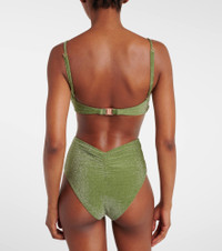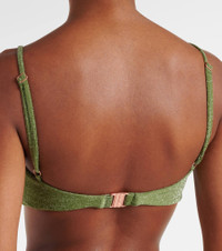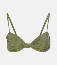 The Heliconia bikini top by Johanna Ortiz will make a statement for your holidays at the seaside or a pool party. This piece features adjustable shoulder straps and is finished with a front knot detail and a shimmering finish. Product Details - Material: 66% polyamide (recycled), 26% metallic fibres, 8% elastane - Care instructions: hand wash - Made in Colombia - Designer color name: Maguey Green - Item color: green - Adjustable shoulder straps - Closure: toggle fastening - Includes: dust bag - Item number: P01039705 Size & Fit - True to size - Unpadded Top - The model seen in the picture is 178cm-5'10", cup size B, and wearing a size XS