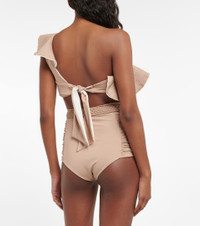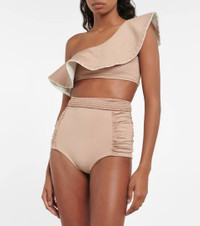 Make a splash in this bikini top by Johanna Ortiz. This asymmetric style has a one-shoulder neckline with a ruffled panel, contrast topstitch detailing, and a close-fitting base. Product Details - Closure: self-ties - Made in Colombia - Lining: partially lined, 20% elastane, 80% polyamide - Designer color name: Ecru - Care instructions: dry clean - Material: 22% elastane, 78% recycled polyester - Item number: P00742310 Size & Fit - True to size - The model seen in the picture is 178cm-5'10", cup size B, and wearing a size XS - Unpadded Top
