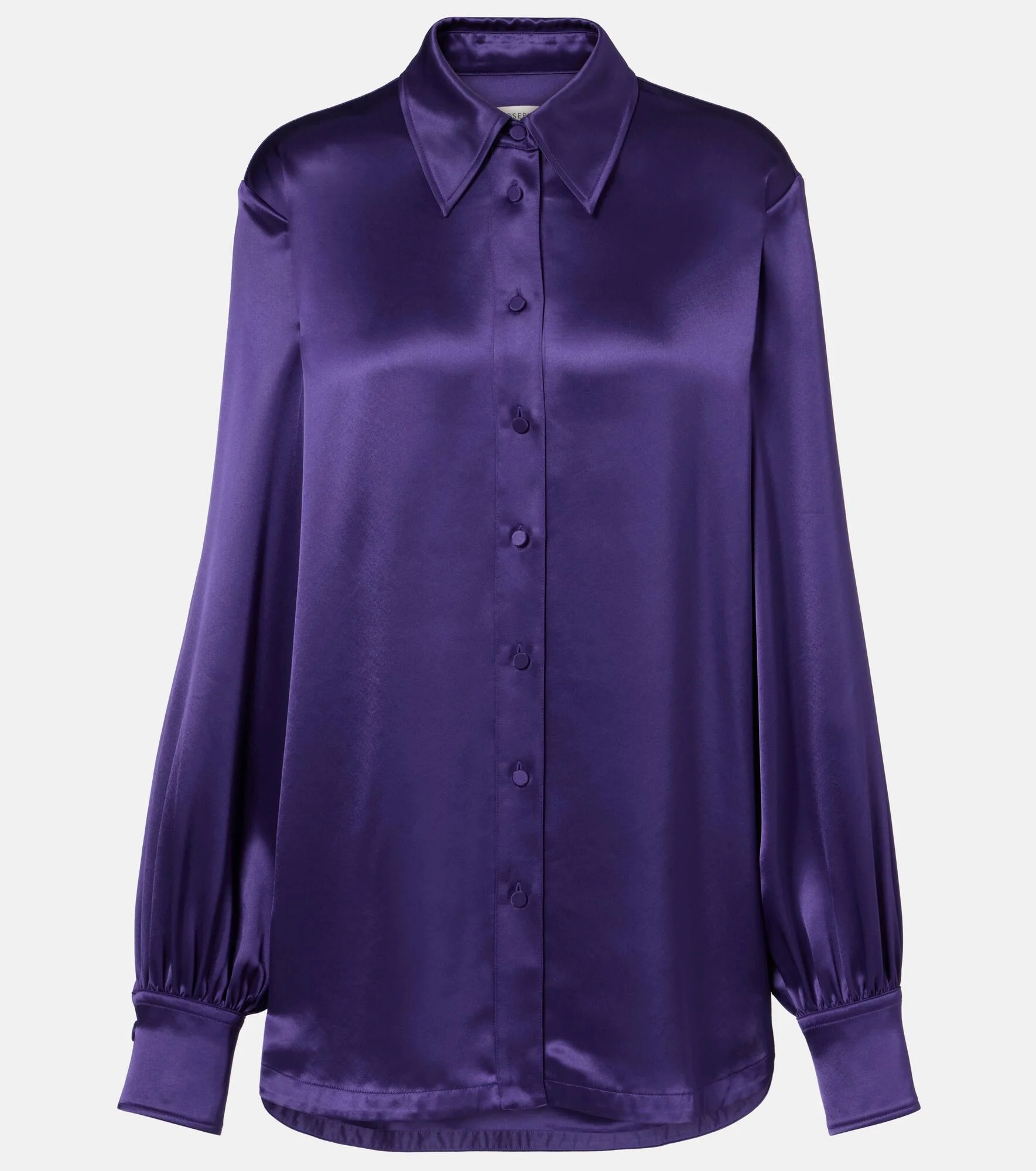 Notable for its understated yet sophisticated approach to design, Joseph delivers timeless and versatile styles for your forever wardrobe. This Dieu lucent satin blouse features a sharp pointed collar, front buttons, and romantic billowing sleeves. Product Details - Material: 81% acetate, 19% polyester - Care instructions: dry clean - Made in China - Designer color name: Violet - Item color: purple - Lining: 79% polyester, 21% viscose - Collar: classic (Straight point) - Closure: buttoned placket - Cuff: buttoned - Hem: uneven - Item number: P01115035 Size & Fit - True to size - For a closer fit, we recommend taking one size down - Dropped shoulders - Oversized - Non-stretchy fabric - Falls below the hip - The model seen in the picture is 178cm-5'10" and wearing a size FR 36