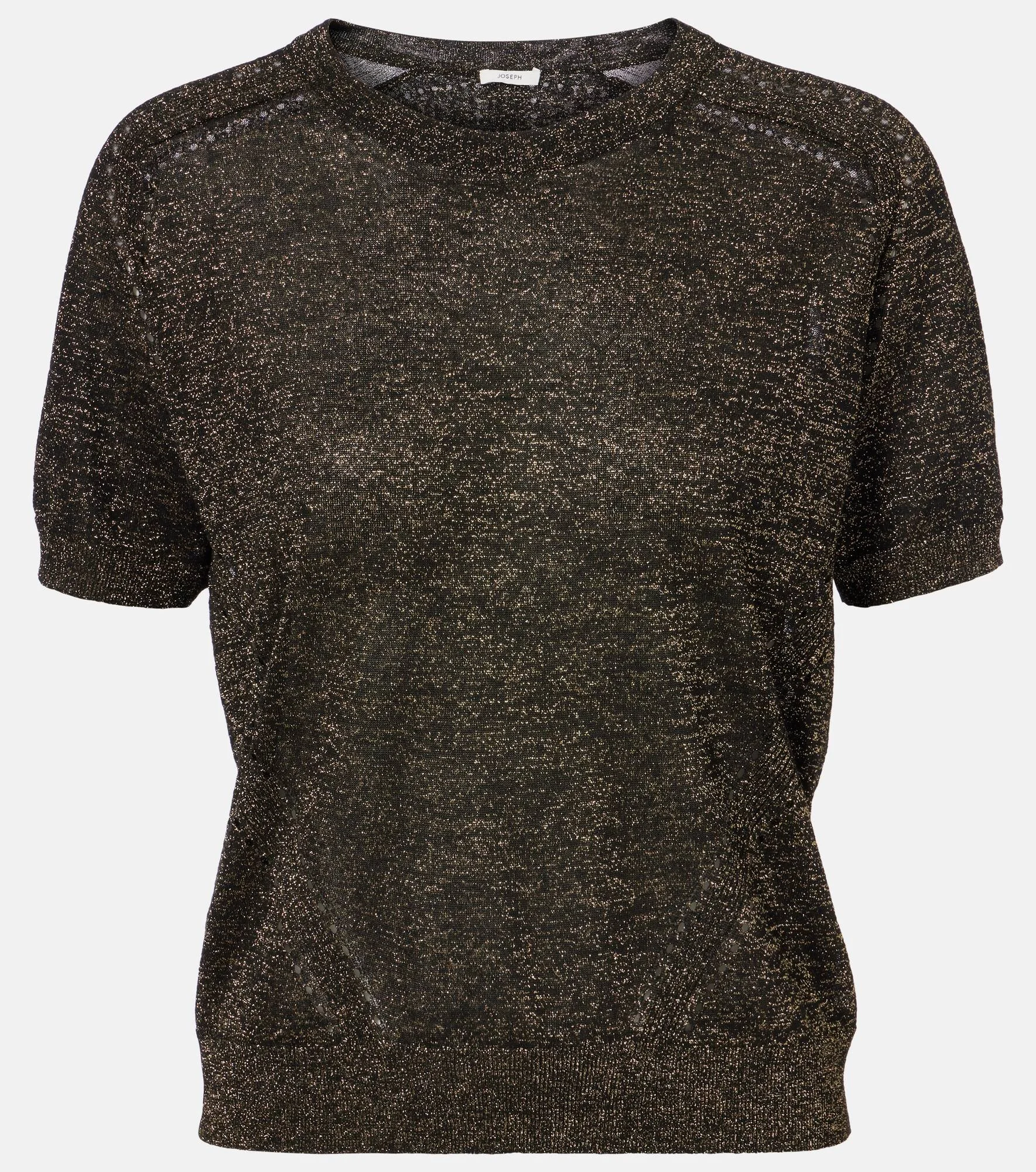 Notable for its understated yet sophisticated approach to design, Joseph delivers the building blocks for your forever wardrobe. The Lille knitted top is crafted from lame yarn and features a crewneck and ribbed-knit trims. Product Details - Material: 70% viscose, 15% polyester, 15% metallic fibres - Care instructions: machine wash - Made in China - Designer color name: Black/Gilt - Item color: black, gold - Collar: crewneck - Cuff: ribbed - Hem: ribbed - Item number: P01115041 Size & Fit - True to size - Straight fit - Slightly stretchy fabric - Slightly cropped - The model seen in the picture is 178cm-5'10" and wearing a size XS