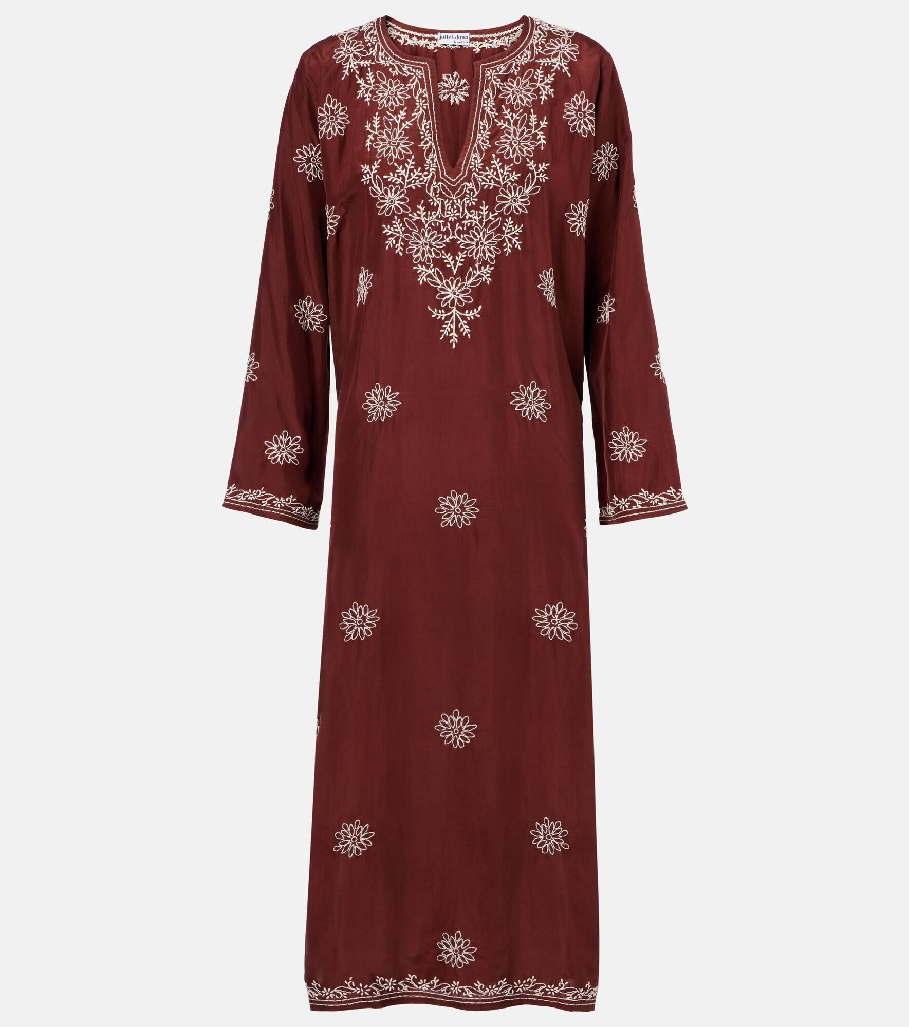 London-based designer Juliet Dunn employs Indian artisans to apply traditional techniques such as block printing, mirror work, and embroidery to her designs. Their impeccable craft is showcased on this silk tunic, covered in delicate embroidered flowers. Product Details - Material: 100% silk - Care instructions: dry clean - Made in India - Designer color name: Brown Cream - Item color: brown - Item number: P01046059 Size & Fit - True to size - Straight fit - Non-stretchy fabric - slit length 57cm-22.5" - The model seen in the picture is 178cm-5'10" and wearing a size 0
