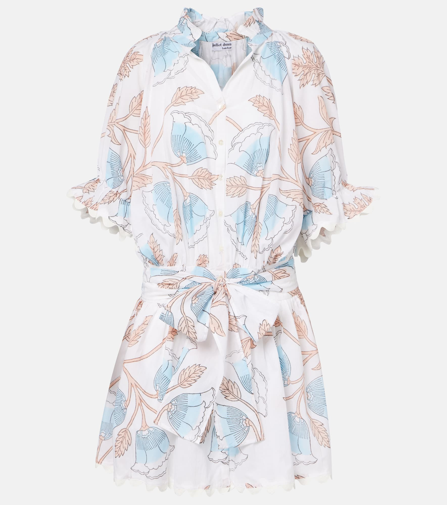 Crafted from pure cotton, this shirt dress from Juliet Dunn showcases an all-over print and scalloped detailing at the cuffs and hem. This design is cut to a relaxed silhouette and features a buttoned front and self-ties for closure. Product Details - Material: 100% cotton - Care instructions: hand wash - Made in India - Designer color name: White/Pale Blue/Bronze - Item color: white, blue, pink - Closure: self-ties, buttoned front - Separate lining slip: 100% cotton - Cuff: elasticated - Item number: P01077200 Size & Fit - True to size - Loose fit, comes with belt - Non-stretchy fabric - The model seen in the picture is 178cm-5'10" and wearing a size 0