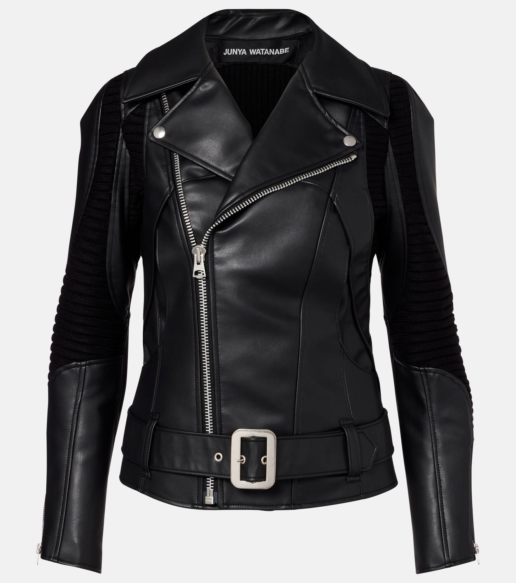 With experimentation at its core, Junya Watanabe creates avant-garde styles by manipulating fabrics and subverting classic codes. This faux leather jacket features padded panels with a belted waist and statement zipped closure. Product Details - Material: 100% polyurethane - Care instructions: dry clean - Made in Japan - Designer color name: Black X Black - Item color: black - Trim: 63% acrylic, 27% wool, 8% nylon, 2% polyurethane - Lining: 100% cupro - Hardware color: silver - Notched lapel - Closure: zipped front - Belt loops - Detachable belt - Pockets: side slit pockets, internal pockets - Zipped cuffs - Item number: P01100424 Size & Fit - Fits small to size - we recommend trying one size larger - Cinched waist - Adjustable at the waist - Partly stretchy fabric - Falls to the hip - The model seen in the picture is 178cm-5'10" and wearing a size S