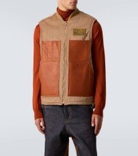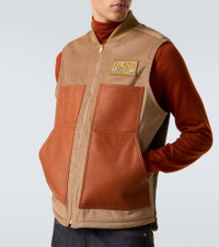With experimentation at its core, Junya Watanabe creates avant-garde styles by manipulating fabrics and subverting classic codes. This cotton and wool vest is structured with leather panels and finished with a logo patch-applique and a soft plush lining. Product Details - Material: 100% cotton - Care instructions: dry clean - Made in Japan - Designer color name: Beige x Brown x Khaki - Item color: beige, brown - Material II: 100% wool - Trim: 70% acrylic, 30% wool - Details: 100% cow leather - Lining: 55% acrylic, 45% polyester - Hardware color: gold - Closure: zipped front - Pockets: slant pockets - Item number: P01098212 Size & Fit - True to size - Straight fit - Non-stretchy fabric - Falls to the hip - The model in the picture is 185cm-6'1" and wearing a size L