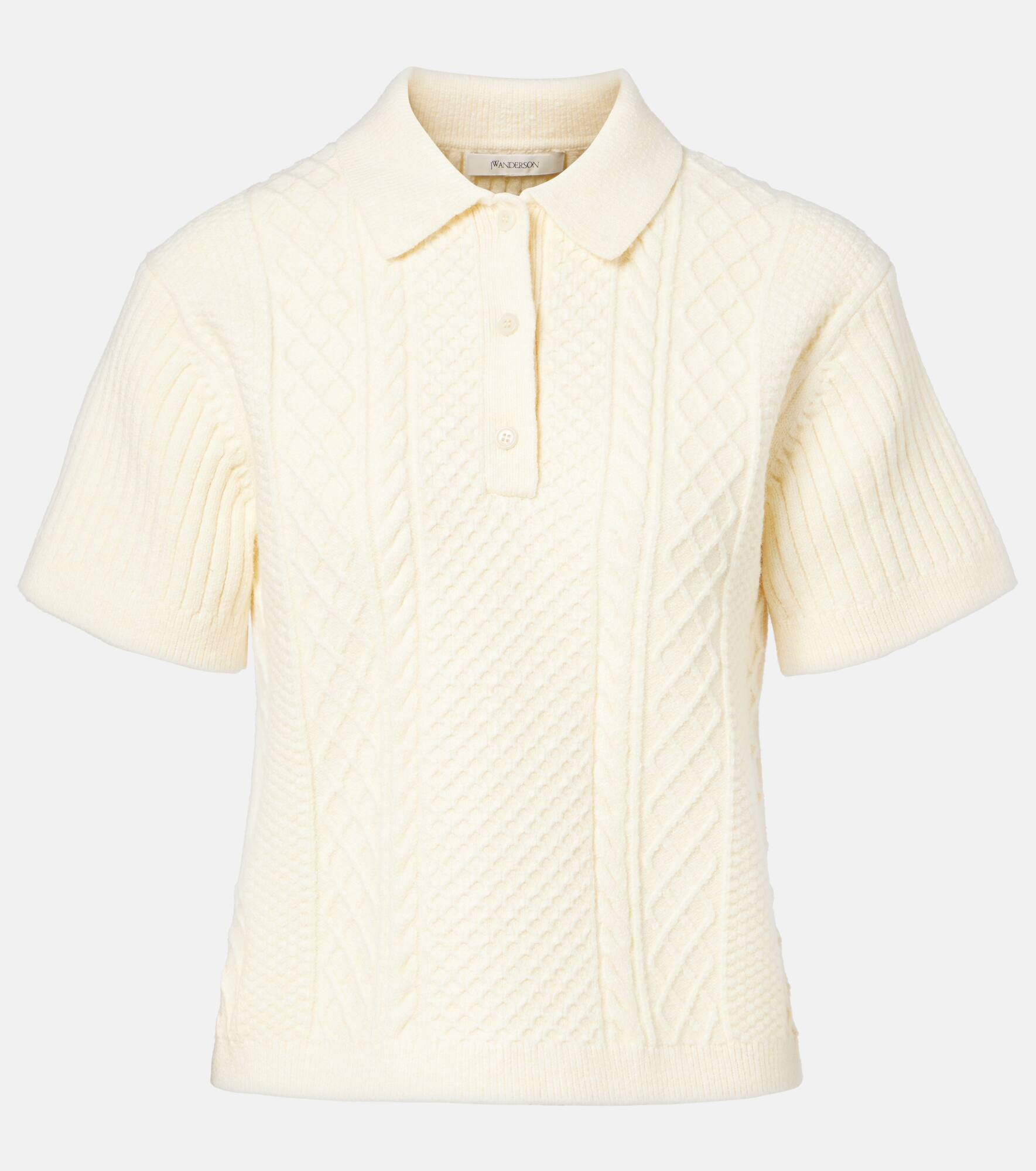 From casualwear to tailoring, JW Anderson marries modernity with style in every design. Crafted from a wool and cotton-blend, this polo shirt features a cable-knit style and a slightly cropped length. Product Details - Material: 27% wool, 27% cotton, 26% polyamide, 17% polyester, 3% elastane - Care instructions: dry clean - Made in China - Designer color name: Ecru - Item color: white - Collar: polo collar - Closure: partially buttoned front - Hem: ribbed - Item number: P01058741 Size & Fit - True to size - Straight fit - Stretchy fabric - Slightly cropped - The model seen in the picture is 178cm-5'10" and wearing a size XS