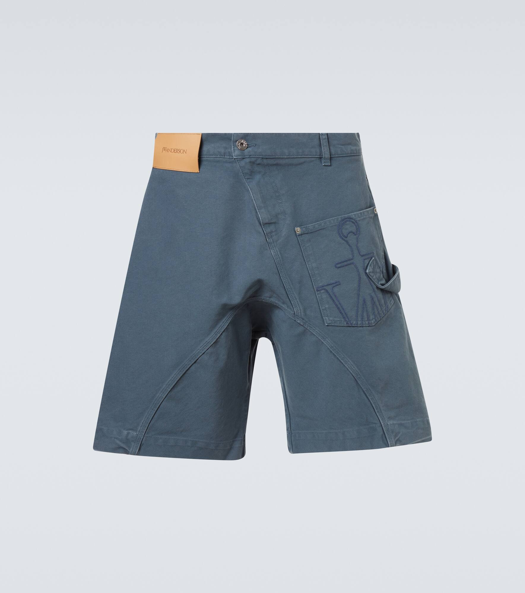 The Twisted Bermuda pants from JW Anderson lend sophistication to a workwear-inspired style. Crafted from cotton canvas, the unique pair features a logo-embroidered back pocket placed at the front and an asymmetrical zip fastening. Product Details - Material: 100% cotton - Care instructions: machine wash at 30 degrees - Made in Portugal - Designer color name: Steel Blue - Item color: blue - Lining: 100% cotton - Belt loops - Pockets: patch pockets, back pockets - Closure: zip and button fastening - Contains non-textile parts of animal origin - Item number: P01049280 Size & Fit - True to size - Non-stretchy fabric - Wide-leg - Height of model is 188cm-74" and wears a size 50