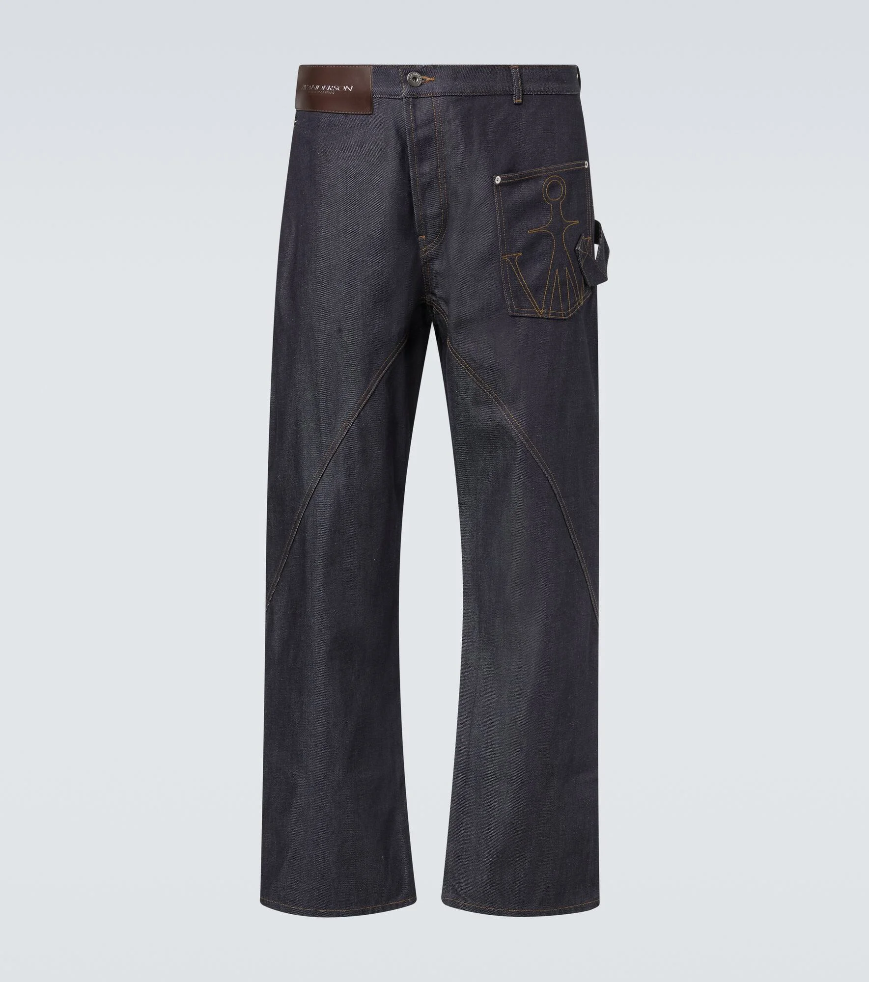 From casualwear to tailoring, JW Anderson marries modernity with style in every design. Crafted in Japan from raw denim, these jeans feature a twisted design, with a logo-embroidered patch pocket and a leather patch on the front. Product Details - Material: 100% cotton - Care instructions: machine wash at 30 degrees - Made in Japan - Color: blue - Designer color name: Indigo - Item color: blue - Contains non-textile parts of animal origin - Item number: P01104779 Size & Fit - True to size - Non-stretchy fabric - Wide-leg - Mid-rise - Height of model is 189cm-74.5" and wears a size 32