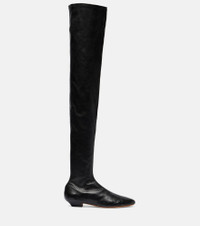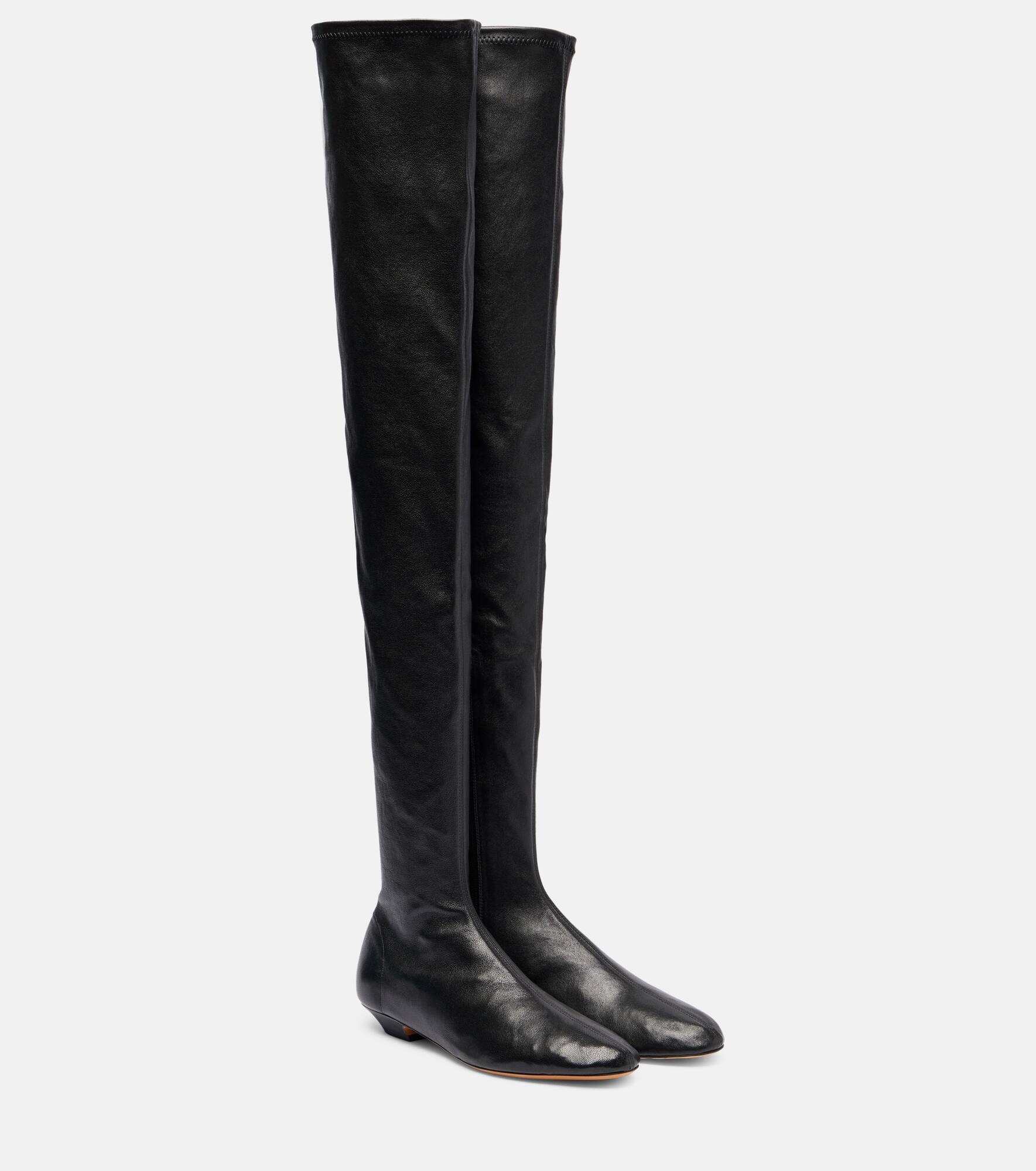 Khaite's minimalist designs exude modern sophistication and effortless elegance. Crafted in Italy from leather, the Apollo over-the-knee boots feature leather insoles and soles on almond-toe silhouettes. Product Details - Upper: leather - Lining: leather, fabric - Sole: leather insole and sole - Toe shape: almond toe - Made in Italy - Includes: dust bags, shoe box - Designer color name: Black - Item color: black - Item number: P01044118 Size & Fit - True to size - Slightly narrow calf - Stretchy fabric - 2cm-1" heel (size EU 38) - 72cm-28.5" shaft height (size EU 38) - 34cm-13.5" shaft width (size EU 38) - shaft width measured on largest part of boot