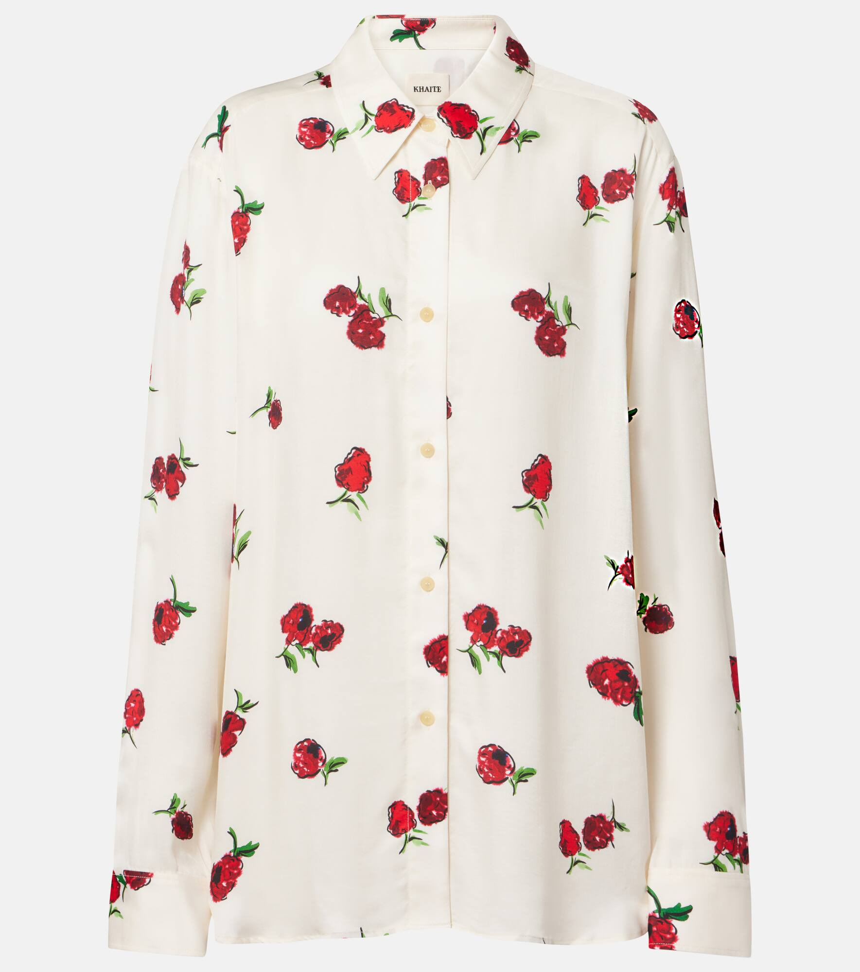 Khaite's minimalist designs exude modern sophistication and effortless elegance. Made from twill with a silky finish, the Argo shirt features an all-over raspberry print and is complete with single-button cuffs. Product Details - Material: 100% viscose - Care instructions: dry clean - Made in the USA - Designer color name: Raspberry/Cream - Item color: white, red - Lining: 100% silk - Details: 100% horn - Contains non-textile parts of animal origin - Collar: classic (Straight point) - Closure: buttoned placket - Standard placket - Cuff: one button - Item number: P01045240 Size & Fit - True to size - Dropped shoulders - Designed for a loose fit - Non-stretchy fabric - Falls below the hip - The model seen in the picture is 178cm-5'10" and wearing a size XS