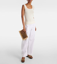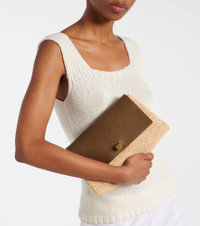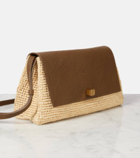 Clean lines and a sculptural silhouette characterize Khaite's Audrey crossbody bag. This summer iteration is made from raffia with a leather flap top and adjustable shoulder strap. Product Details - Material: raffia - Lining: unlined - Made in Italy - Designer color name: Natural/Olive - Item color: beige - Trim: leather - Item number: P01038619 Size & Fit - Height 15,5cm-6" - Min. width 23cm-9" - Max. width 26cm-10" - Depth 9cm-3.5" - Min. length shoulder strap 98cm-38.5" - Max. length shoulder strap 118cm-46.5"