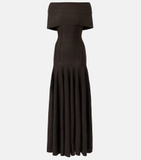 Ava off-the-shoulder pleated wool-blend maxi dress Dark brown