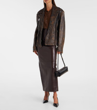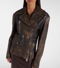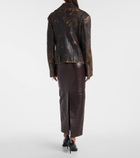 Khaite's minimalist designs exude modern sophistication and effortless elegance. Made in the USA from distressed leather, the Catalina jacket is a classic biker style with silver-toned hardware and a flap pocket. Product Details - Material: 100% lamb leather - Care instructions: specialist clean - Made in the USA - Designer color name: Black/Natural - Item color: black, brown - Hardware color: silver - Notched lapel - Closure: zipped front - Shoulder pads - Pockets: zipped pockets, snap-buttoned pocket - Cuff: zipped - Fully lined - Contains non-textile parts of animal origin - Item number: P01077597 Size & Fit - True to size - Oversized shoulders - Shoulder pad inserts - Straight fit - Non-stretchy fabric - Falls to the hip - Height of model is 179cm-70.5" and wears a size XS