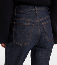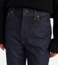 Khaite's minimalist designs exude modern sophistication and effortless elegance. Made in the USA, the Danielle jeans are cut to a straight-leg silhouette with a high-rise waistline. Product Details - Material: 98% cotton, 2% polyurethane - Care instructions: dry clean - Made in the USA - Designer color name: Benson - Item color: blue - Hardware color: antique gold - Closure: zip and button fastening - Pockets: five pockets - Belt loops - Item number: P01077544 Size & Fit - Fits small to size - we recommend trying two sizes larger - Non-stretchy fabric - Straight leg - High-rise - Height of model is 175cm-69" and wears a size 27