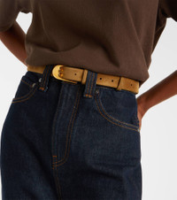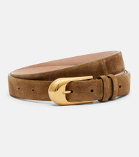 Khaite's minimalist designs exude modern sophistication and effortless elegance. The Dome belt is crafted in Italy from suede, and fastens with a sophisticated, rounded buckle. Product Details - Material: calf leather (suede) - Lining: calf leather - Made in Italy - Designer color name: Mud - Item color: brown - Hardware color: gold - Item number: P01070990 Size & Fit - Width 2,5cm-1" - Buckle width 3cm-1"