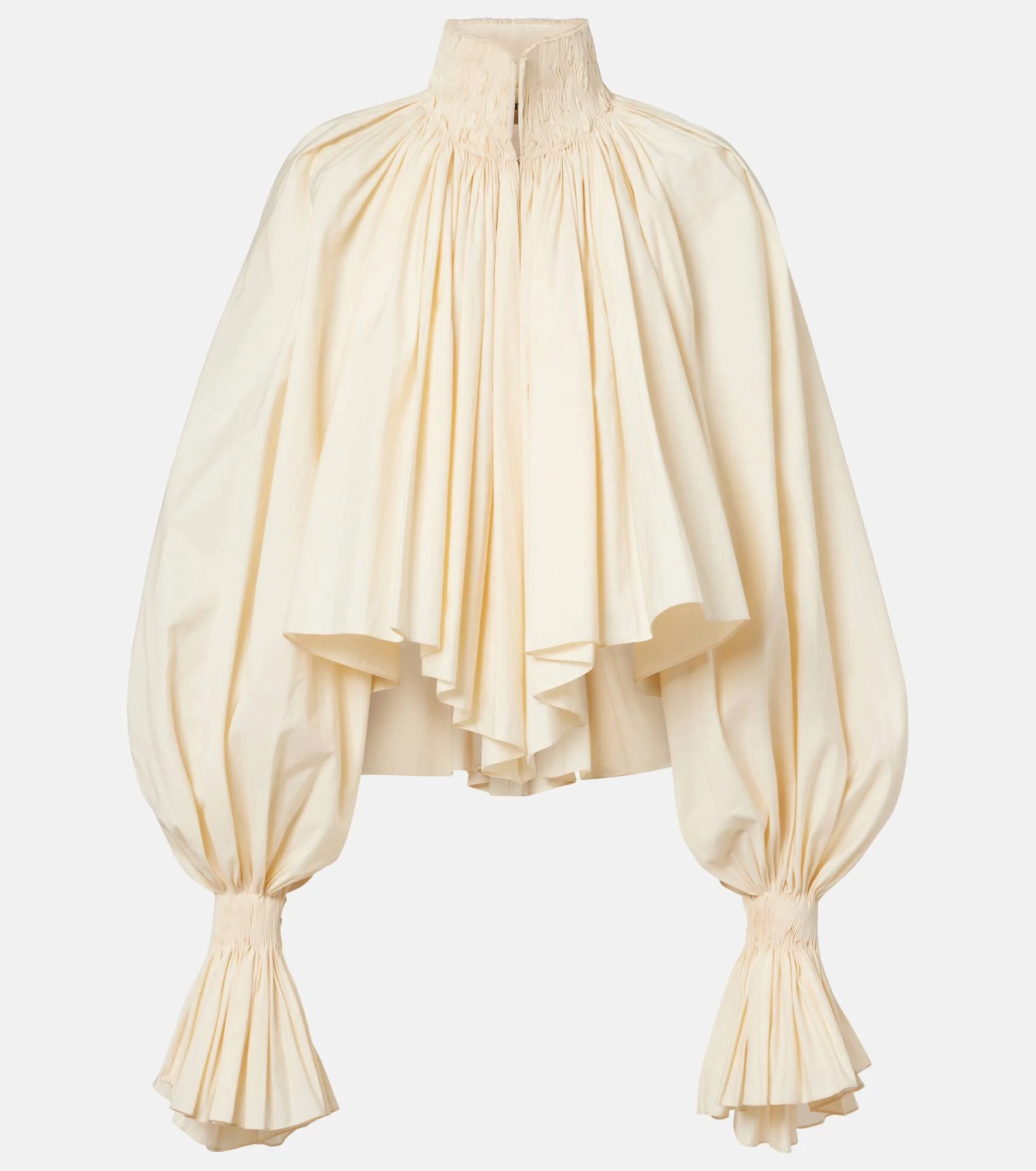 The Durer blouse from Khaite has smocked detailing around the high neckline and sleeves, ruffles cascading down the front, and puffy, voluminous sleeves. Made in the USA, the design has cotton-blend construction. Product Details - Material: 83% cotton, 17% polyester - Care instructions: dry clean - Made in the USA - Color: white - Designer color name: Bone - Item color: white - Closure: hook fastening - Cuff: buttoned - Item number: P01107112 Size & Fit - True to size - Oversized - Non-stretchy fabric - Height of model is 177cm-69.5" and wears a size XS