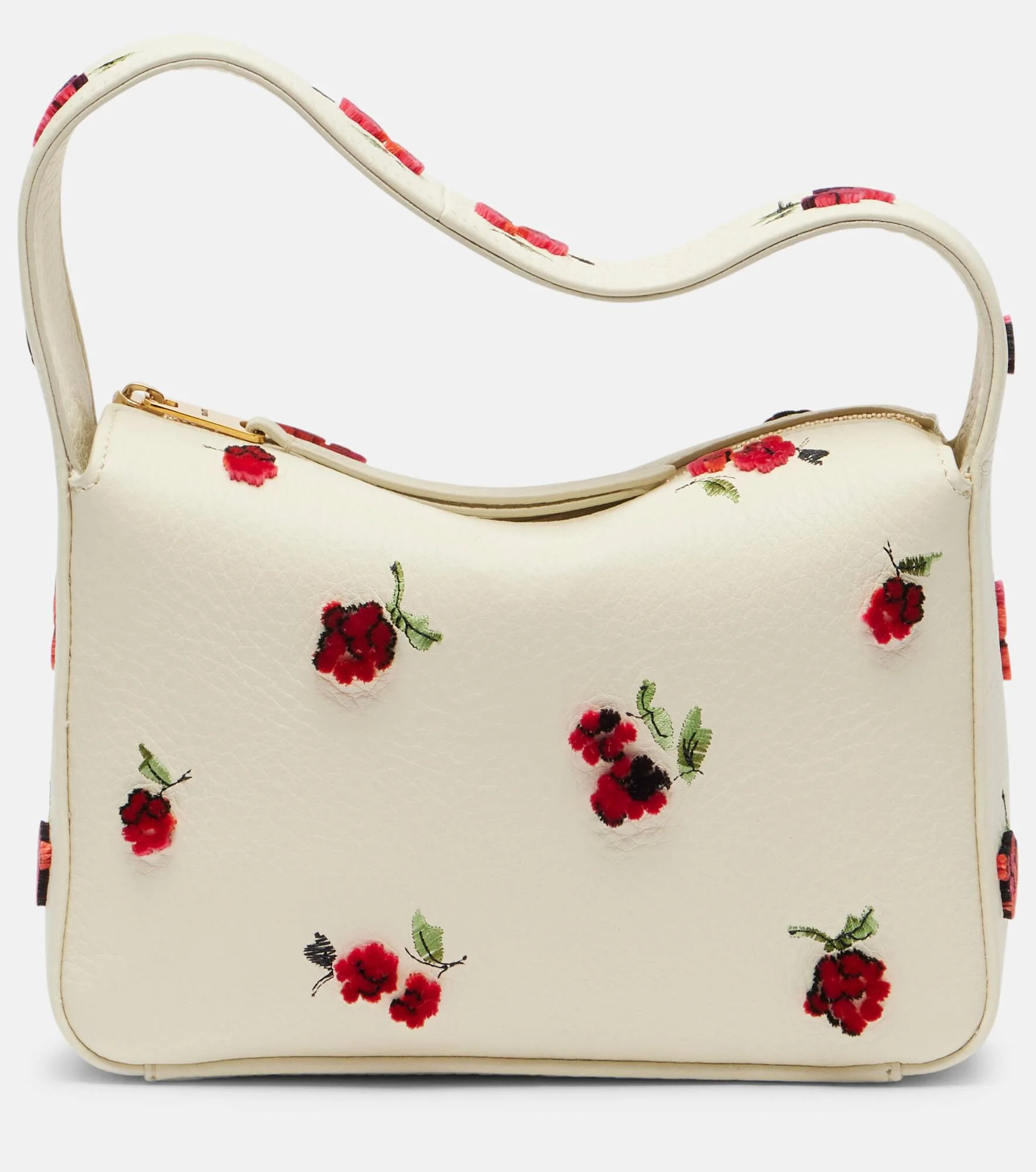 Khaite's minimalist designs exude modern sophistication and effortless elegance. Made from white leather, the Elena shoulder bag arrives in Small proportions and is characterized by its raspberry-inspired embroideries. Product Details - Material: leather - Lining: leather - Made in Italy - Designer color name: Raspberry - Item color: beige, red - Top handle - Internal details: single compartment, internal slot pocket - Closure: zipped top - Hardware color: gold - Item number: P01056941 Size & Fit - Height 13,5cm-5.5" - Width 19,5cm-7.5" - Depth 6,5cm-2.5" - Length of handle 30cm-12"