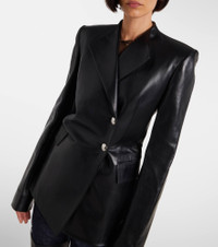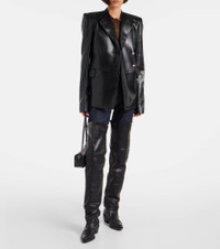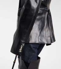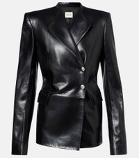 Khaite's minimalist designs exude modern sophistication and effortless elegance. Made in the USA from black leather, the Elona jacket features a blazer-inspired silhouette, a cinched waistline, and silver-toned hardware. Product Details - Material: 100% lamb leather - Care instructions: specialist clean - Made in the USA - Designer color name: Black - Item color: black - Hardware color: silver - Closure: double-breasted - Shoulder pads - Pockets: flap pockets, side slit pockets - Cuff: four buttons - Item number: P01077599 Size & Fit - True to size - Shoulder pad inserts - Cinched waist - Non-stretchy fabric - Falls below the hip - Height of model is 175cm-69" and wears a size US 4