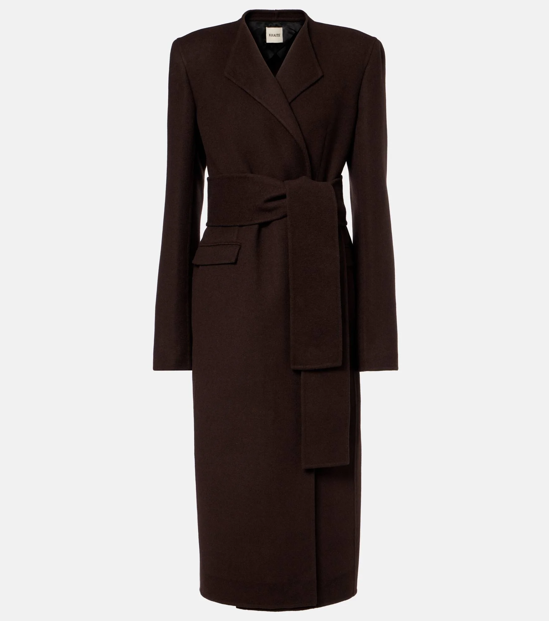 Khaite's minimalist designs exude modern sophistication and effortless elegance. Made in Italy from dark brown wool, the Jelson coat is a classic wrap style with an oversized belt and flap pockets. Product Details - Material: 100% wool - Care instructions: dry clean - Made in Italy - Designer color name: Dark Brown - Item color: brown - Shoulder pads - Self-tie belt - Quarter-lined - Pockets: flap pockets, side slit pockets - Vent: single - Item number: P01077601 Size & Fit - True to size - Shoulder pad inserts - Loose fit, comes with belt - Non-stretchy fabric - slit length 35,0cm-14" - Height of model is 179cm-70.5" and wears a size US 4