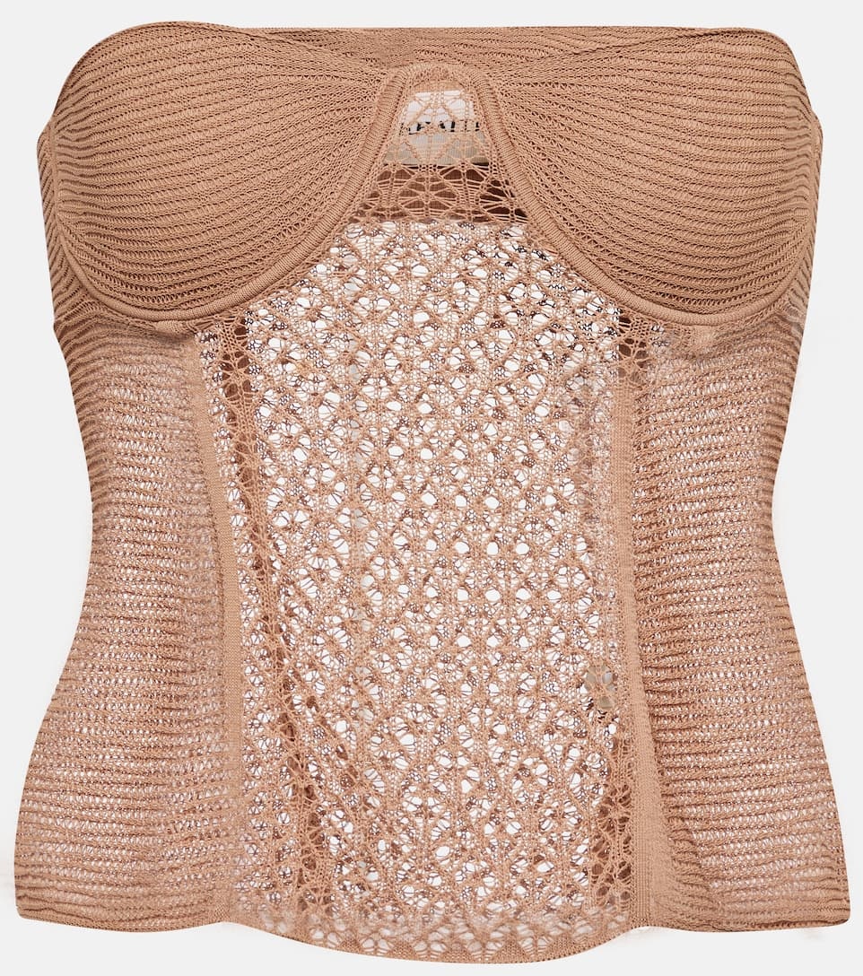 The Lori top from Khaite is defined by the brand’s careful balance of structure, fluidity, strength, and softness. This piece features a featherweight diamond lace construction and a bustier silhouette. Product Details - Material: 97% viscose, 3% polyamide - Care instructions: dry clean - Made in Italy - Designer color name: Almond - Item number: P00795390 Size & Fit - Fits small to size - we recommend trying one size larger - Strapless - Fitted - Mid-weight material - Cropped - Underwired top - The model seen in the picture is 178cm-5'10" and wearing a size S