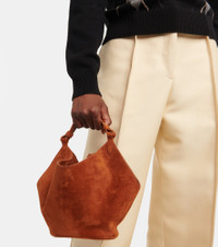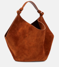A minimalist, sculptural silhouette defines the Lotus Mini tote bag from Khaite. Crafted in Italy from supple calfskin suede in a caramel brown hue, this bag boasts a compact size with ample carrying space. Product Details - Top handle - Made in Italy - Designer color name: Caramel - Comes with dust bag - Internal details: suede lining - Material: cow leather - Closure: open top - Item number: P00698212 Size & Fit - Height 15,5cm-6" - Min. width 16cm-6.5" - Max. width 35cm-14" - Depth 15cm-6" - Length of handle 23cm-9"