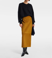 Khaite's minimalist designs exude modern sophistication and effortless elegance. The Loxley maxi skirt boasts a minimal yet characterful design, made in brown suede and featuring a corset-like waist shaped by darts. Product Details - Material: 100% lamb leather (suede) - Care instructions: specialist clean - Made in Italy - Designer color name: Toffee - Item color: brown - Lining: 95% silk, 5% elastane - Closure: invisible zipper - Long vent - Item number: P01077576 Size & Fit - Fits large to size - we recommend trying one size smaller - Non-stretchy fabric - High-waisted - slit length 46,0cm-18" - The model seen in the picture is 178cm-5'10" and wearing a size US 2