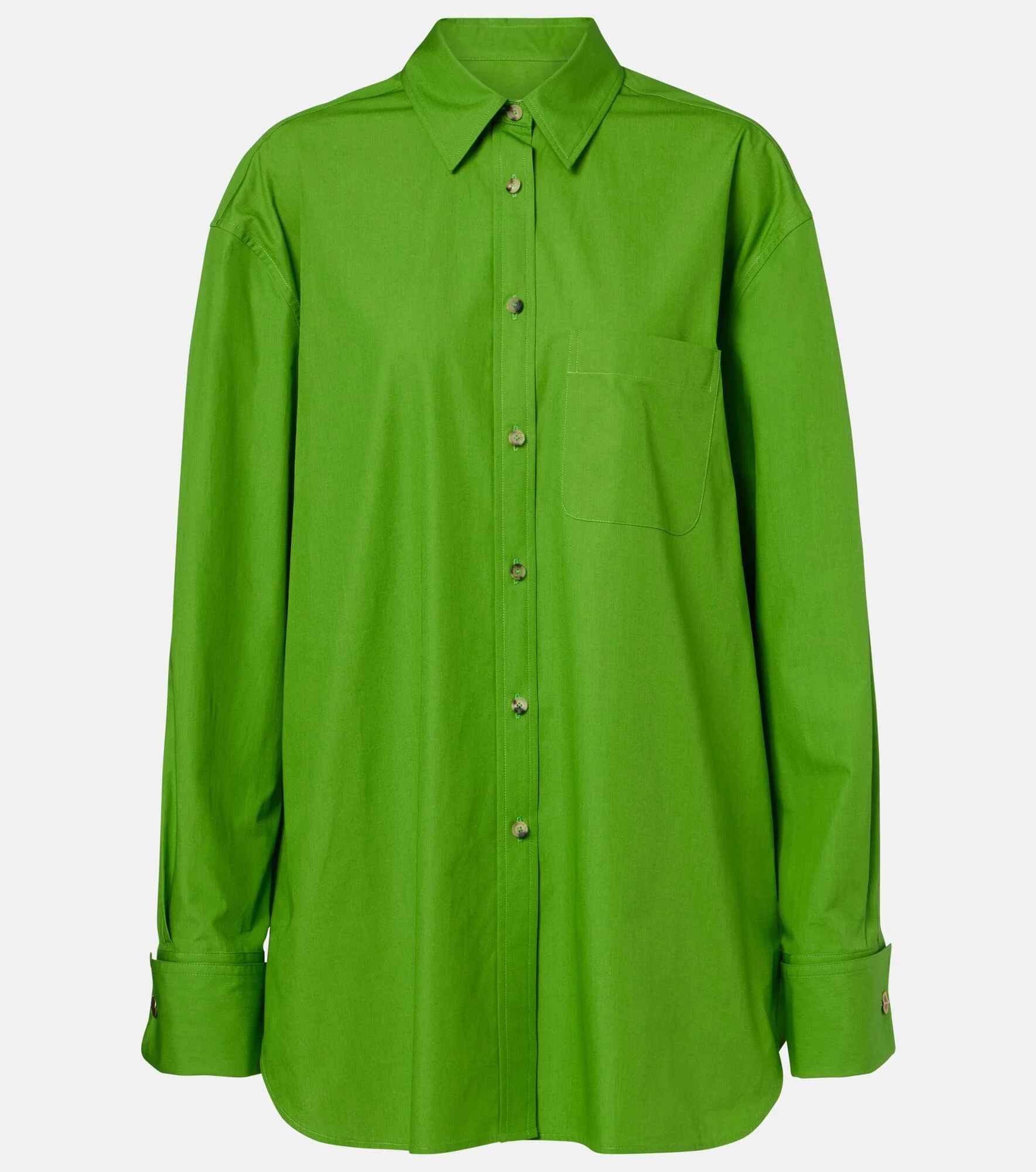 Khaite's minimalist designs exude modern sophistication and effortless elegance. The Newton shirt is a classic silhouette crafted from crisp cotton poplin in a refreshing green hue. Product Details - Material: 100% cotton (organic) - Care instructions: dry clean - Made in Italy - Color: green - Designer color name: Absinthe - Details: 100% water-buffalo horn - Contains non-textile parts of animal origin - Collar: classic (Straight point) - Closure: buttoned front - Pockets: rounded chest pocket - Cuff: French square - Item number: P01145677 Size & Fit - True to size - Dropped shoulders - Designed for a loose fit - Non-stretchy fabric - Falls below the hip - The model seen in the picture is 178cm-5'10" and wearing a size XS