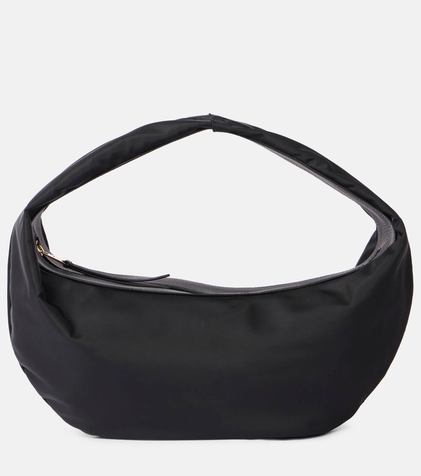 Product Details - Material: nylon - Lining: nylon - Made in Italy - Designer color name: Black - Item color: black - Hardware color: gold - Closure: zipped top - Trim: leather - Item number: P01052966 Size & Fit - Height 19cm-7.5" - Max. width 35cm-14" - Max. depth 13cm-5" - Length of handle 54cm-21.5"