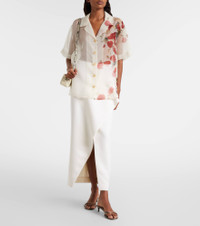 Khaite's minimalist designs exude modern sophistication and effortless elegance. The Riordan shirt has short sleeves and sheer silk organza construction featuring a floral print on one side. Product Details - Material: 100% silk - Care instructions: dry clean - Made in Italy - Color: white - Designer color name: Cream/Red - Item color: white, multicolor - Closure: buttoned front - Item number: P01107109 Size & Fit - True to size - Dropped shoulders - Designed for a loose fit - Non-stretchy fabric - Falls below the hip - Height of model is 174cm-68.5" and wears a size XS