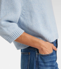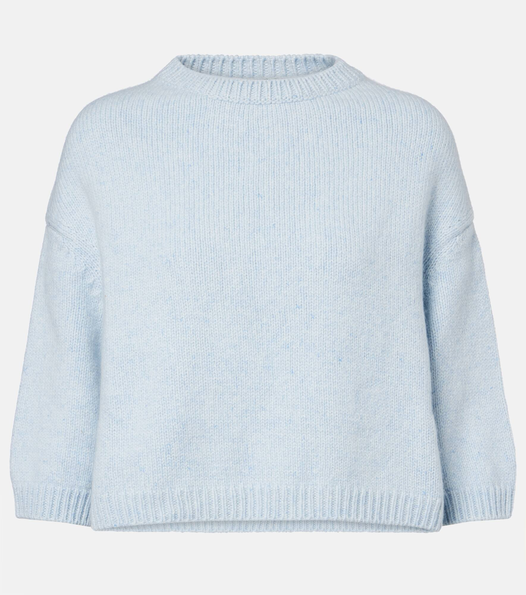 Khaite's wardrobe staples exude ease and modern sophistication. Knitted from pure cashmere for warmth and softness, the Sabine sweater features dropped shoulders, a classic crewneck, and three-quarter sleeves. Product Details - Material: 100% cashmere - Care instructions: dry clean - Made in Italy - Designer color name: Atmosphere - Item color: blue - Collar: crewneck - Cuff: ribbed - Hem: ribbed - Item number: P01045251 Size & Fit - True to size - Dropped shoulders - Designed for a loose fit - Stretchy fabric - Slightly cropped - Height of model is 180cm-71" and wears a size XS
