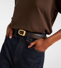 Khaite's minimalist designs exude modern sophistication and effortless elegance. The Saddle belt is crafted from leather that is 30mm in width and boasts an equestrian-inspired buckle reminiscent of riding stirrups. Product Details - Material: calf leather - Lining: calf leather - Made in Italy - Designer color name: Dark Brown - Item color: brown - Hardware color: gold - Item number: P01070995 Size & Fit - Width 3cm-1" - Buckle width 3cm-1"