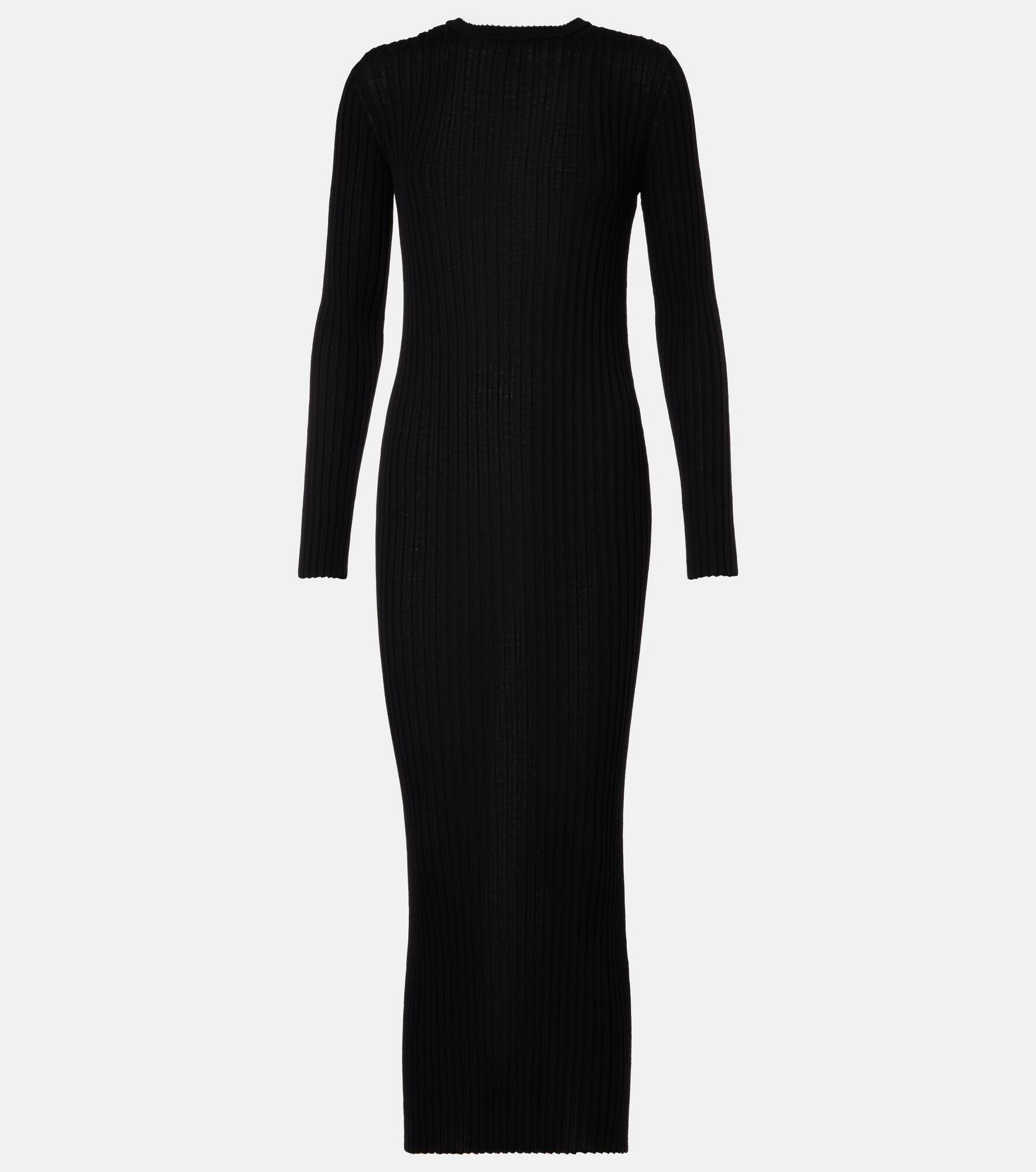 The Sigrid maxi dress from Khaite is knitted from fine wool and features dimensional ribbing for a sculpted effect. The elegant silhouette is finished with a high neckline and an open back with distressed edges. Product Details - Material: 99% wool, 1% polyamide - Care instructions: do not wash - Made in Italy - Designer color name: Black - Item color: black - Hem: knit - Cuff: knit - Item number: P01046179 Size & Fit - Fits large to size - we recommend trying two sizes smaller - Low back - Cinched waist - Stretchy fabric - The model seen in the picture is 178cm-5'10" and wearing a size XS