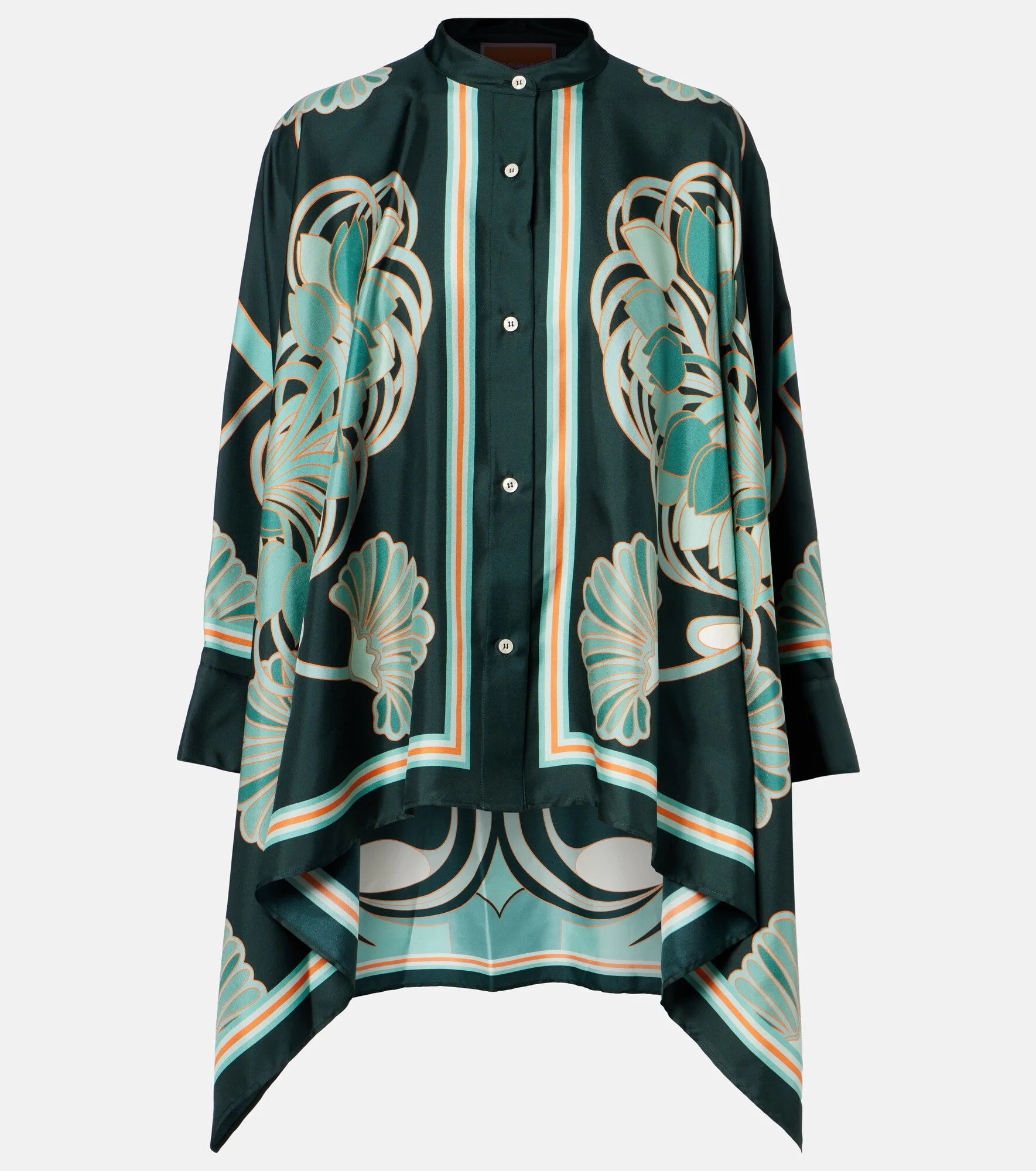 The Foulard silk twill shirt showcases La DoubleJ's love for bold patterns. Made in Italy, the design's asymmetric silhouette and relaxed fit create a dynamic sense of movement. Product Details - Material: 100% silk - Care instructions: dry clean - Made in Italy - Color: green - Designer color name: Blooming Tulip Placee - Closure: buttoned placket - Collar: band - Cuff: one button - Item number: P01166225 Size & Fit - True to size - Designed for a loose fit - Non-stretchy fabric - Falls below the hip - The model seen in the picture is 178cm-5'10" and wearing a size XS
